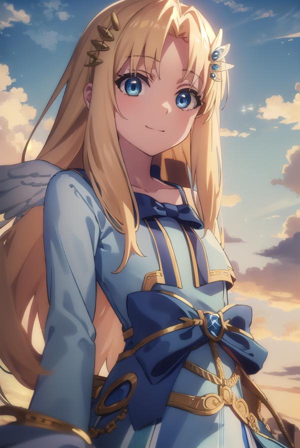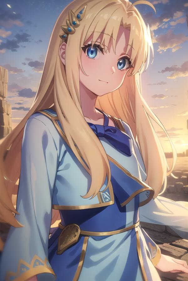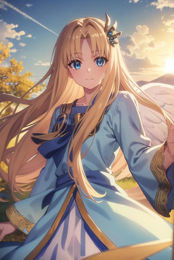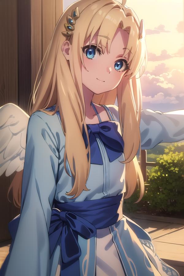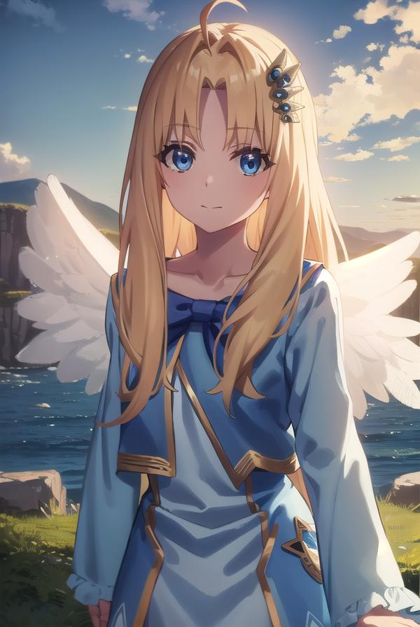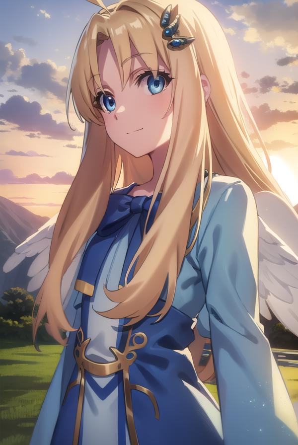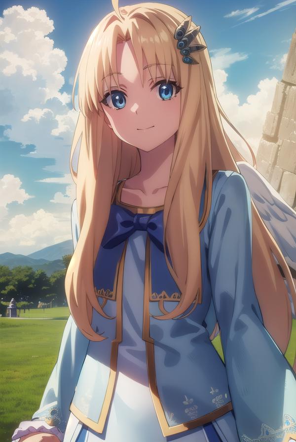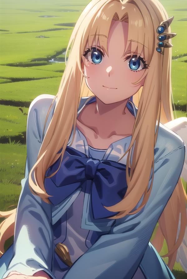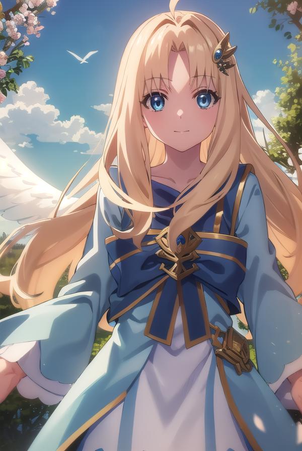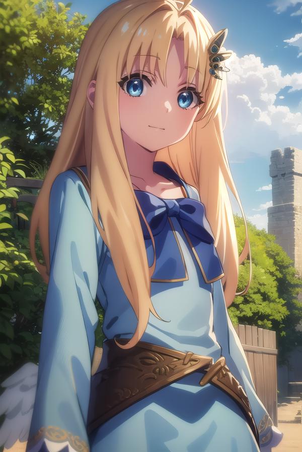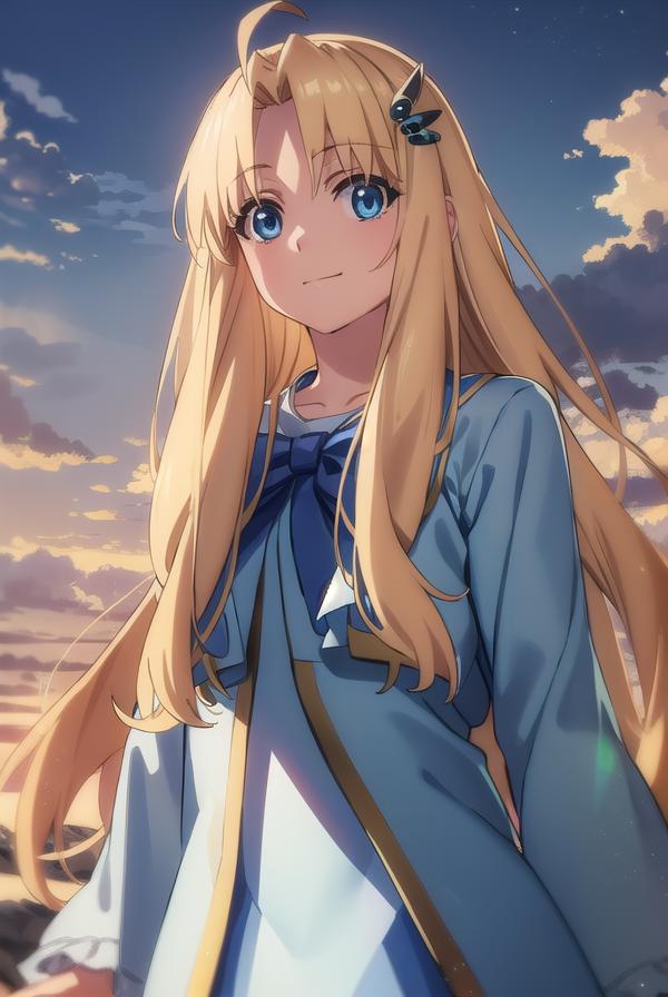 filo, long hair, bangs, blue eyes, blonde hair, hair ornament, ahoge, (parted bangs:1.5), hair intakes,