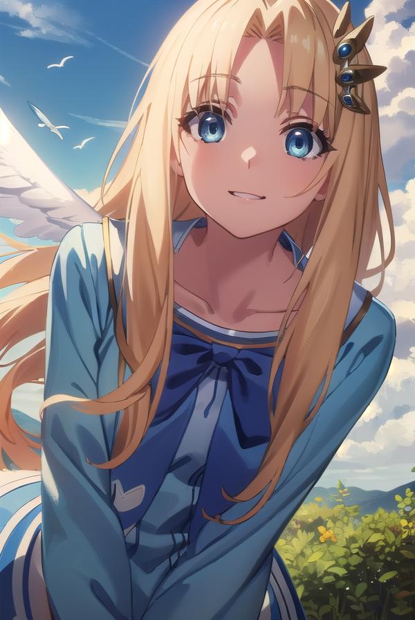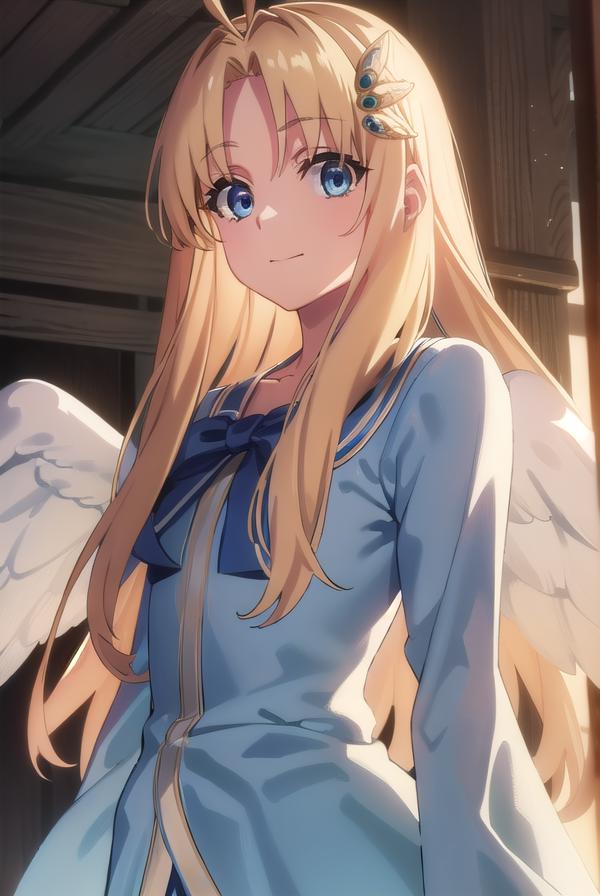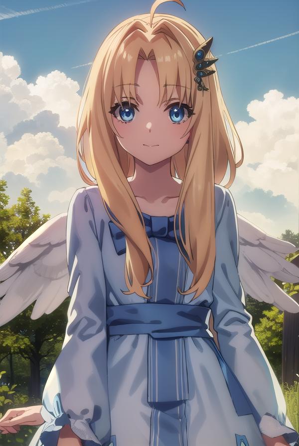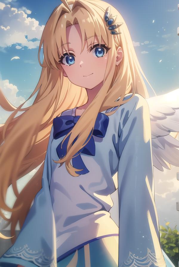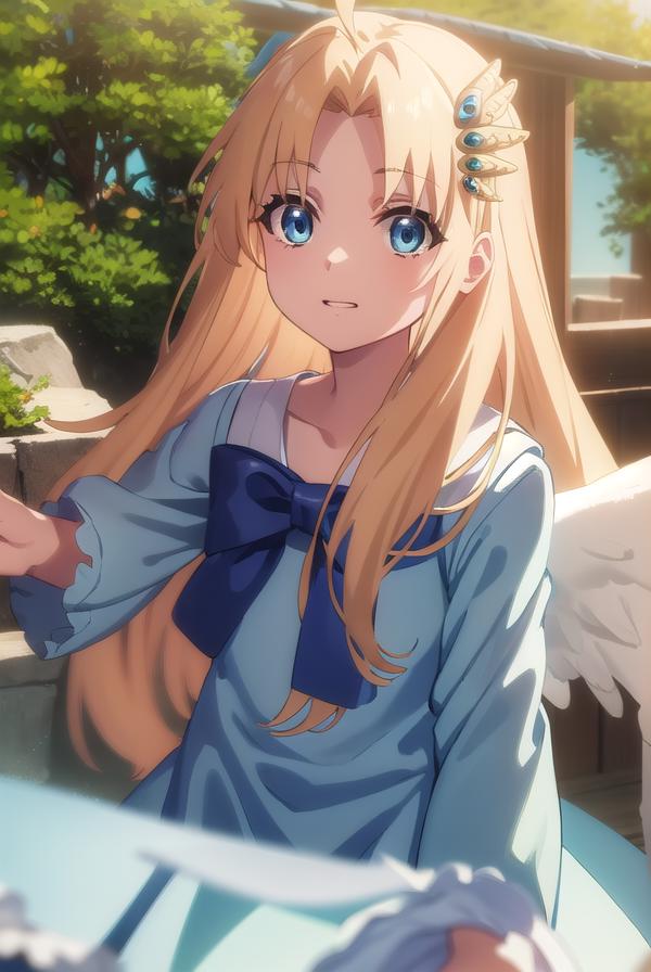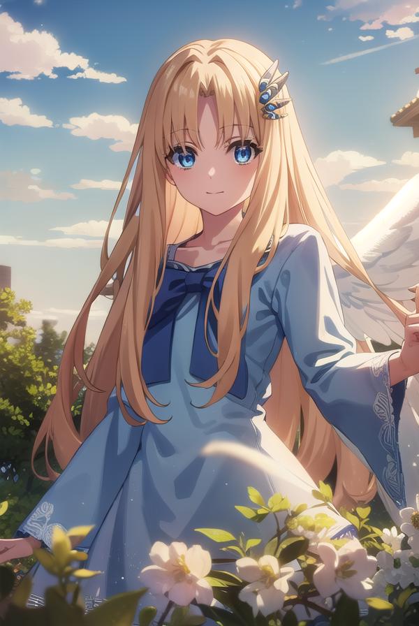 long sleeves, dress, bow, wings, white dress, blue bow, feathered wings, white wings, bird wings,