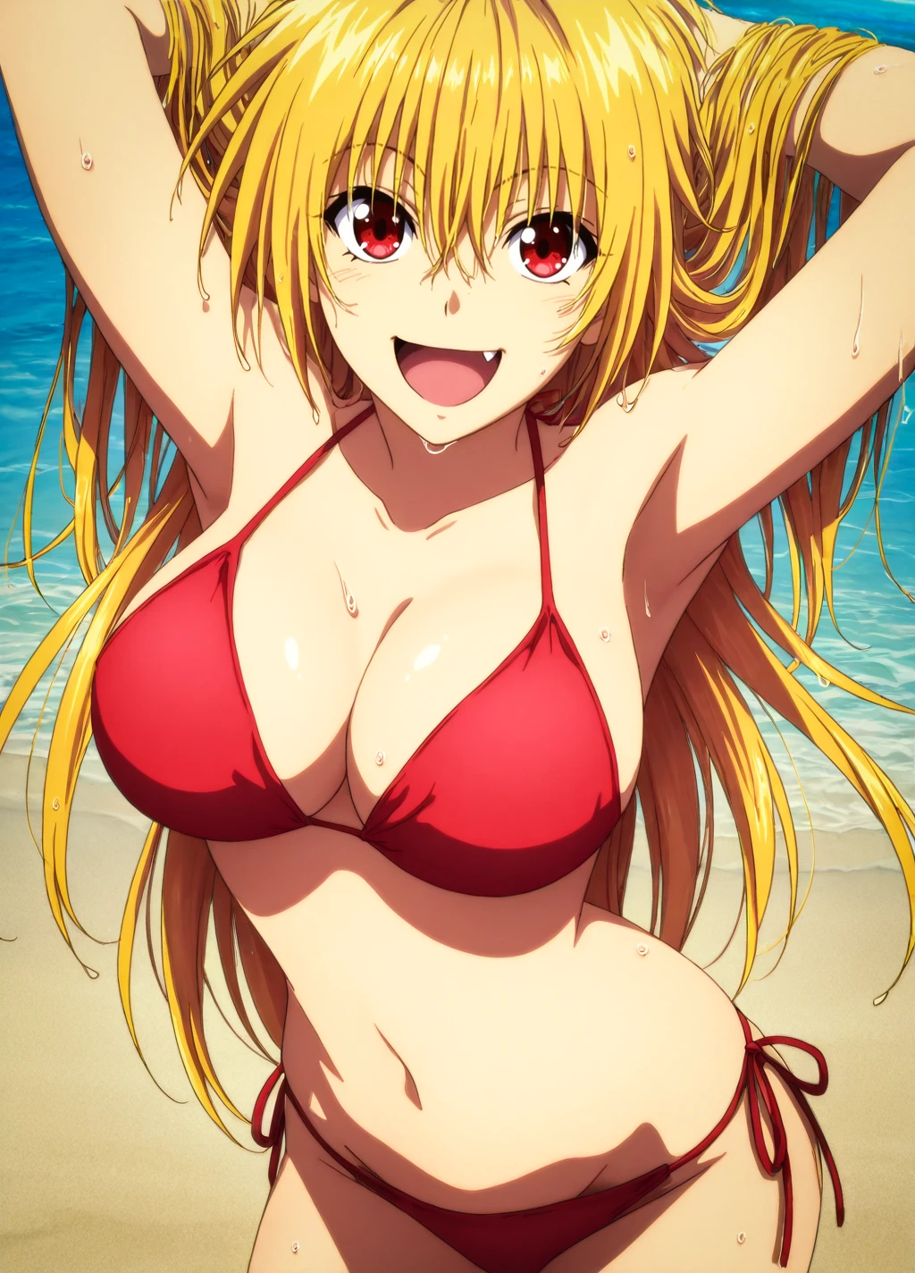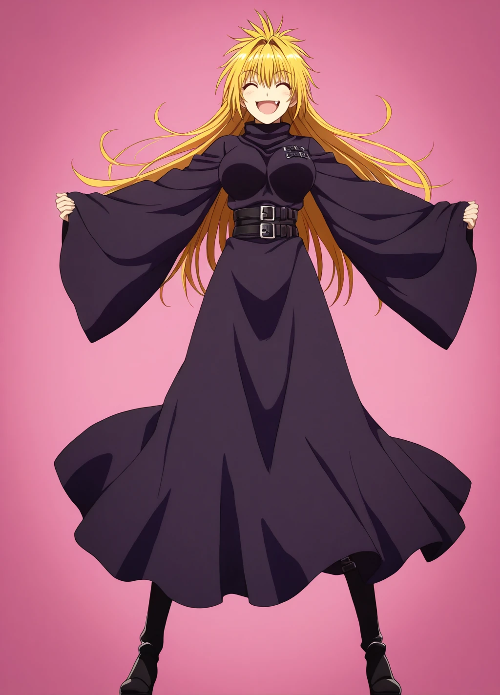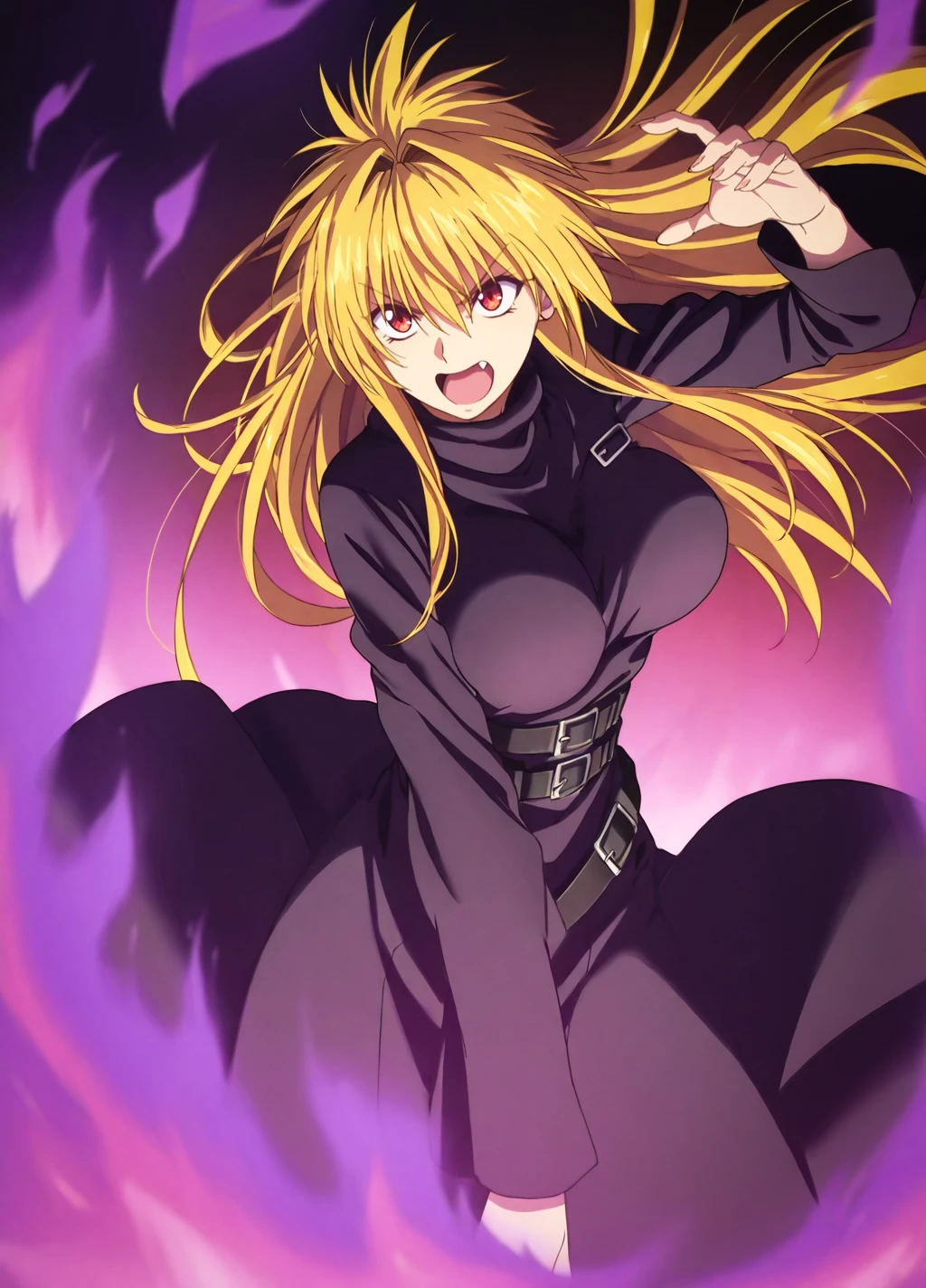 renge1, blonde hair, solo, 1girl,fang, long hair,large breasts, dress, long sleeves, belt, multiple belts, red eyes, wide sleeves,robe,buckle,turtleneck,