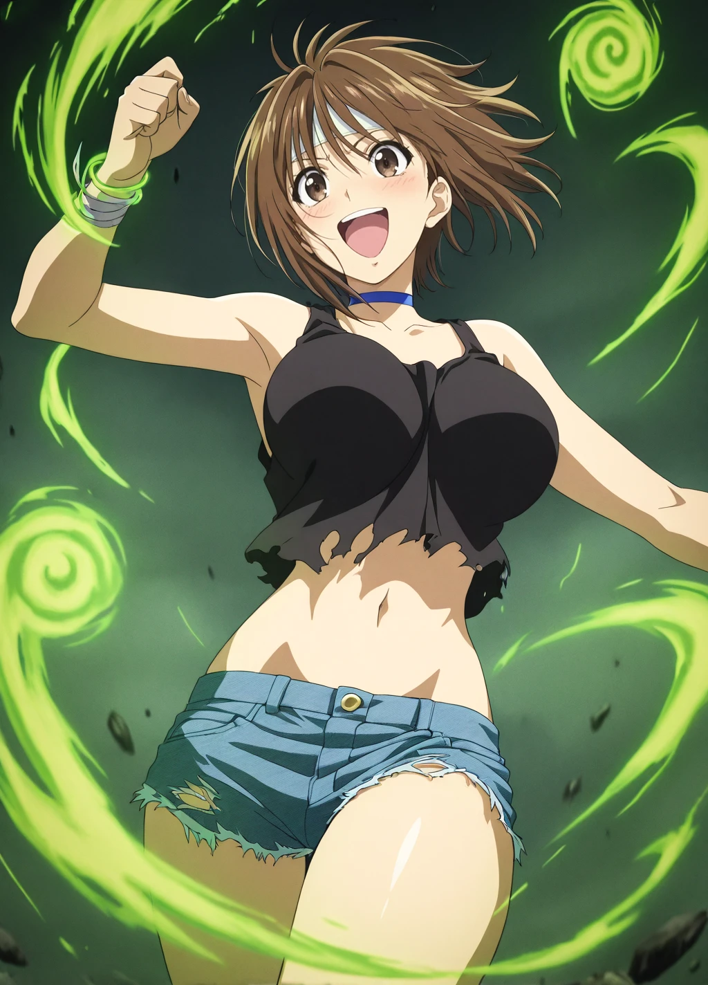 fuuko1, 1girl, solo, brown hair, choker, bare shoulders, brown eyes, short hair, large breasts, headband, blue eyes, jewelry, black tank top,navel,midriff,denim, denim shorts