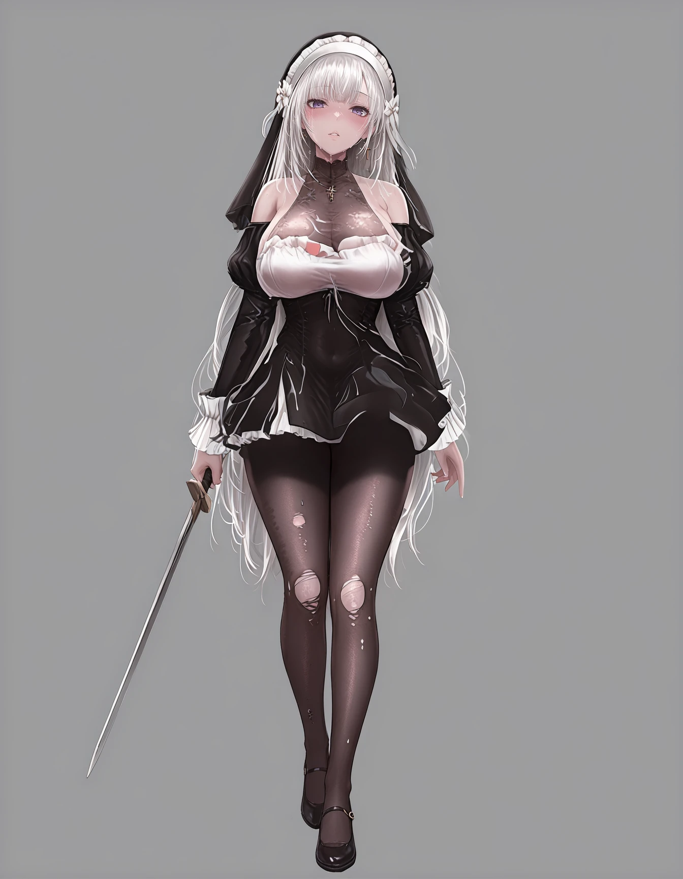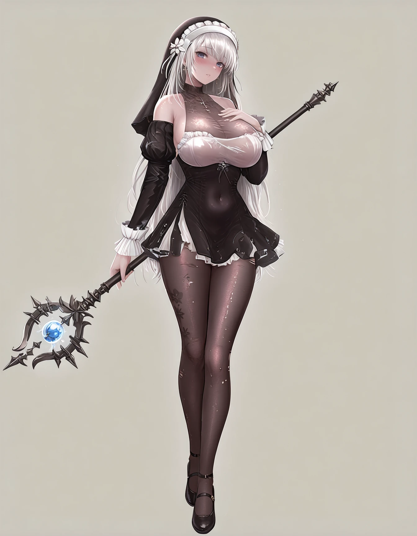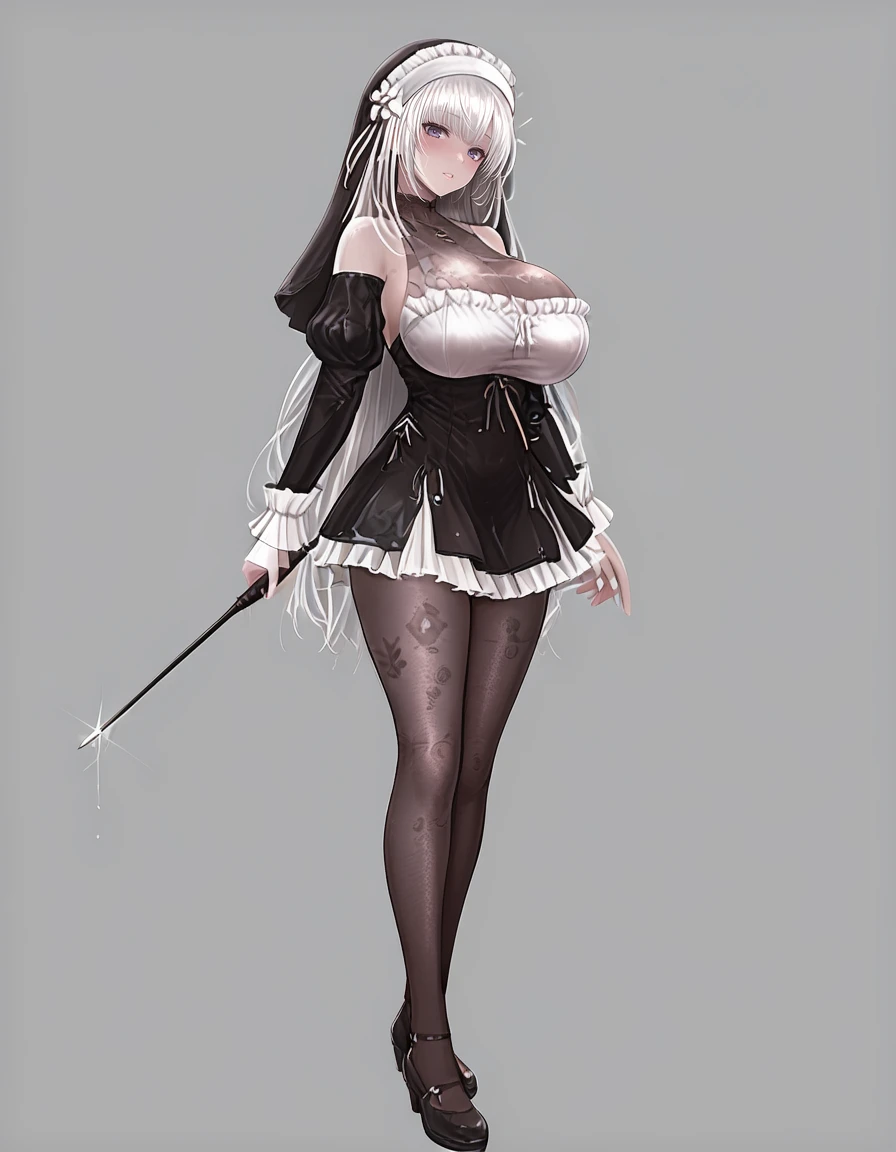 mai_leliass2,aged_up,very_long_hair,white_hair,purple_eyes,large_breasts,nun,hair_ornament,veil,frilled_dress,black_dress,see-through_cleavage,juliet_sleeves,detached_sleeves,black_pantyhose,floral_print,mary_janes,holding_wand