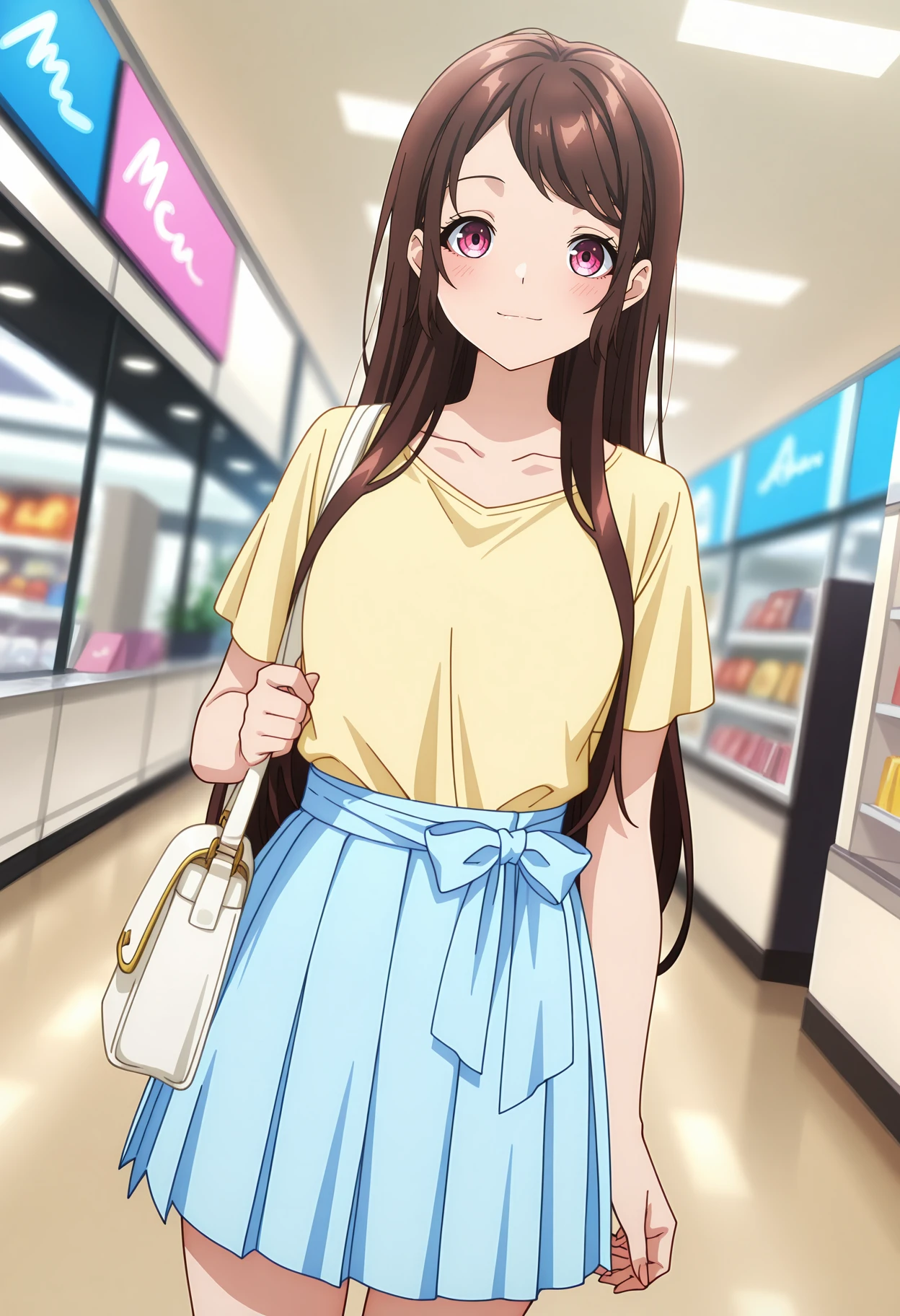yellow shirt, collarbone, pleated sleeves, short sleeves, shirt tucked in, pleated skirt, light blue skirt, waist bow, light blue bow, white shoulder bag