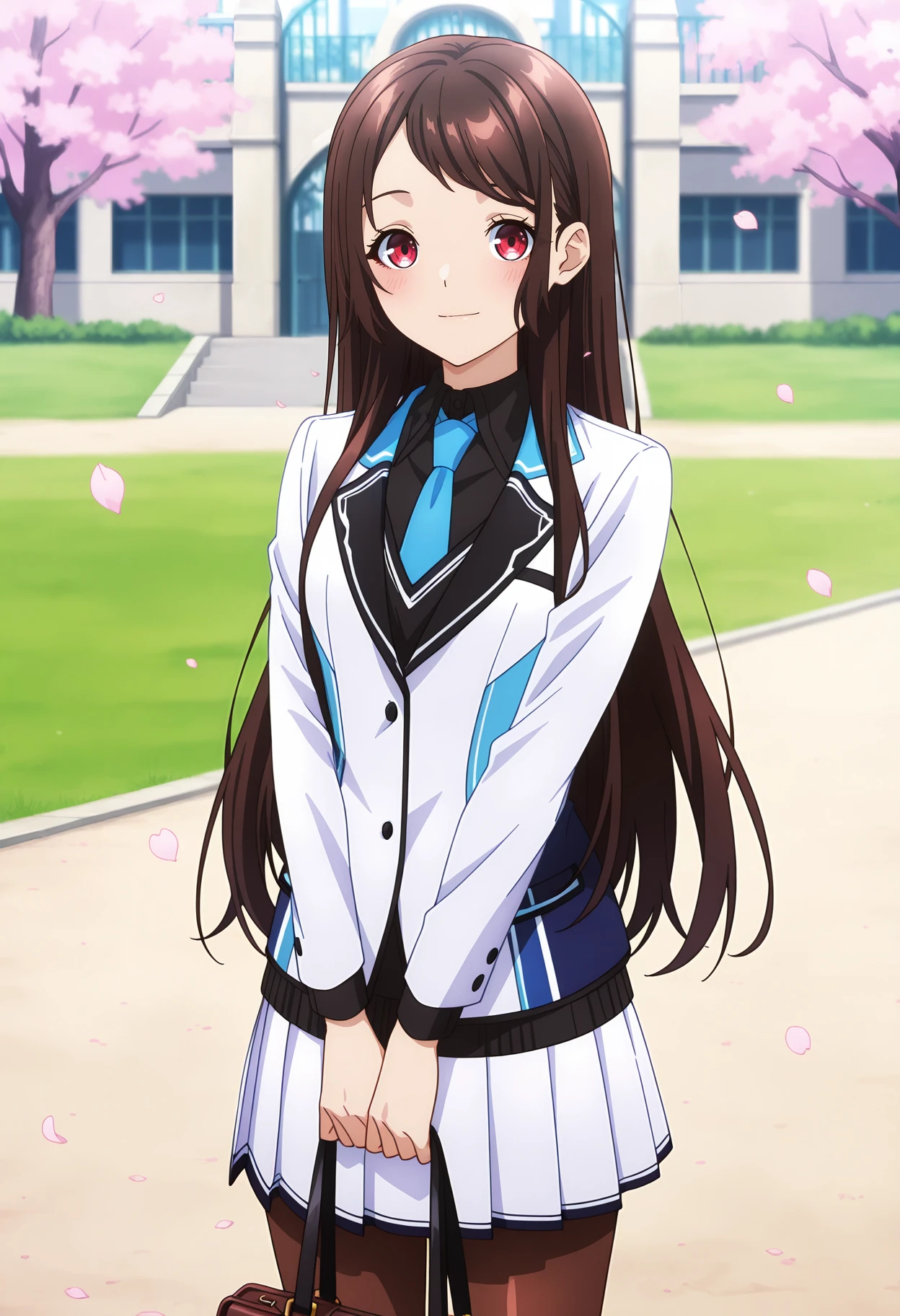 multicolored jacket, black shirt, blue necktie, pleated skirt, white skirt, brown pantyhose