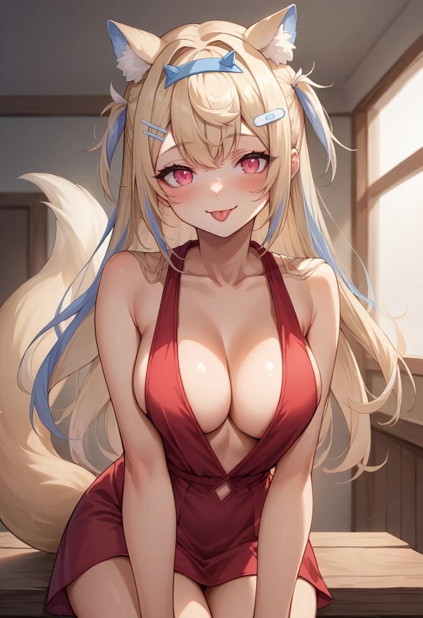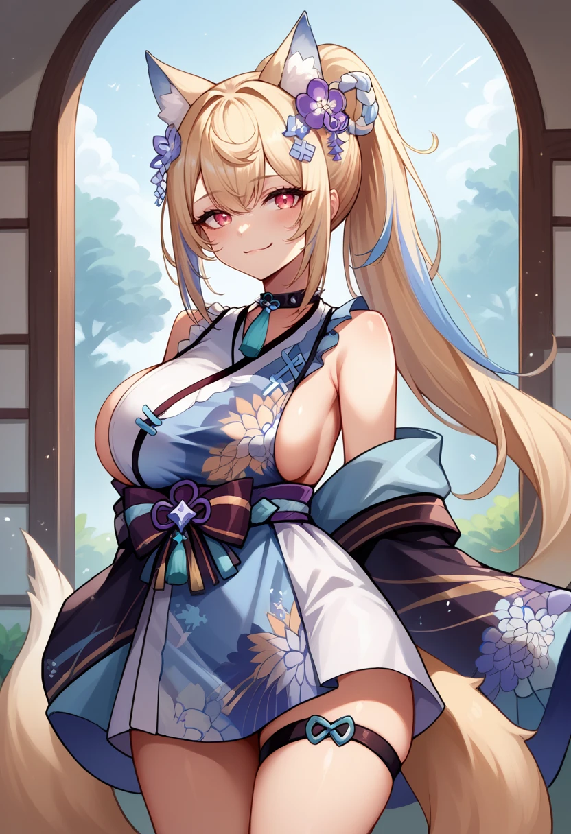 FuwawaNewYears, long hair, ponytail, streaked hair, kouhaku nawa hair bow, hair flower, spiked choker, neck tassel, tail, blue kimono, floral print, short kimono, sleeveless, single detached sleeve, blue sash, thigh strapLet me know if you have any issues.