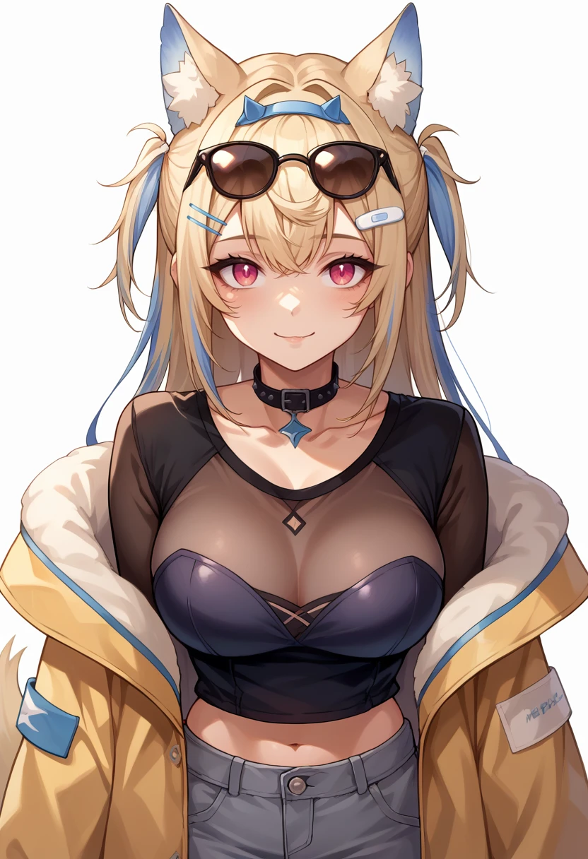 FuwawaBase, long hair, two side up, streaked hair, hairband, hairclip, tail, black collar, chain, white dress, short dress, detached collar, frilled shirt collar, clothing cutout, black jacket, fur-trimmed jacket, blue belt, single thighhigh, fishnet thighhighs, white sneakersBase outfit without jacket: