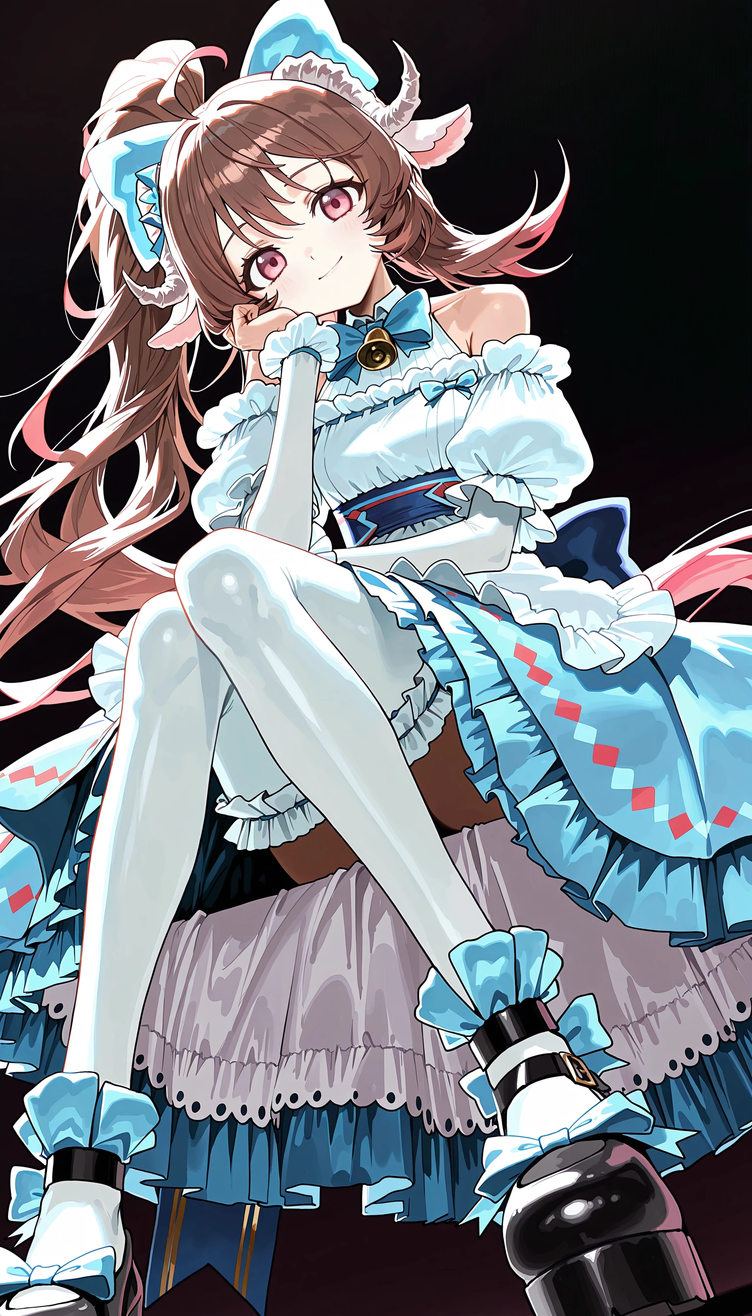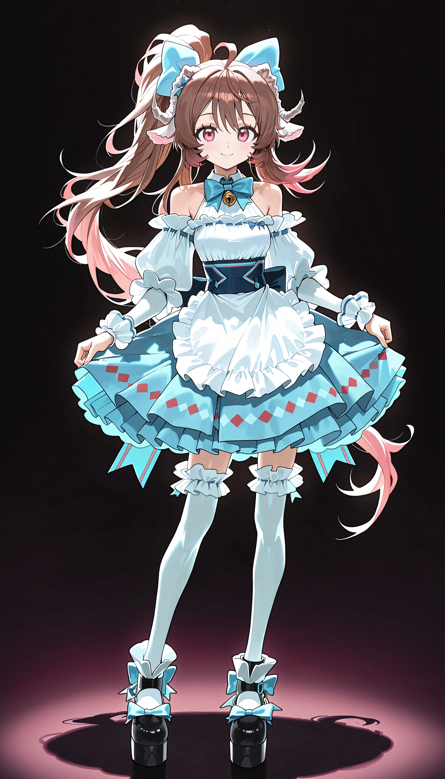 pink eyes, brown hair, sheep horns , ahoge, long high ponytail ,sheep ears, blue hair bow, neck bell , blue bowtie,