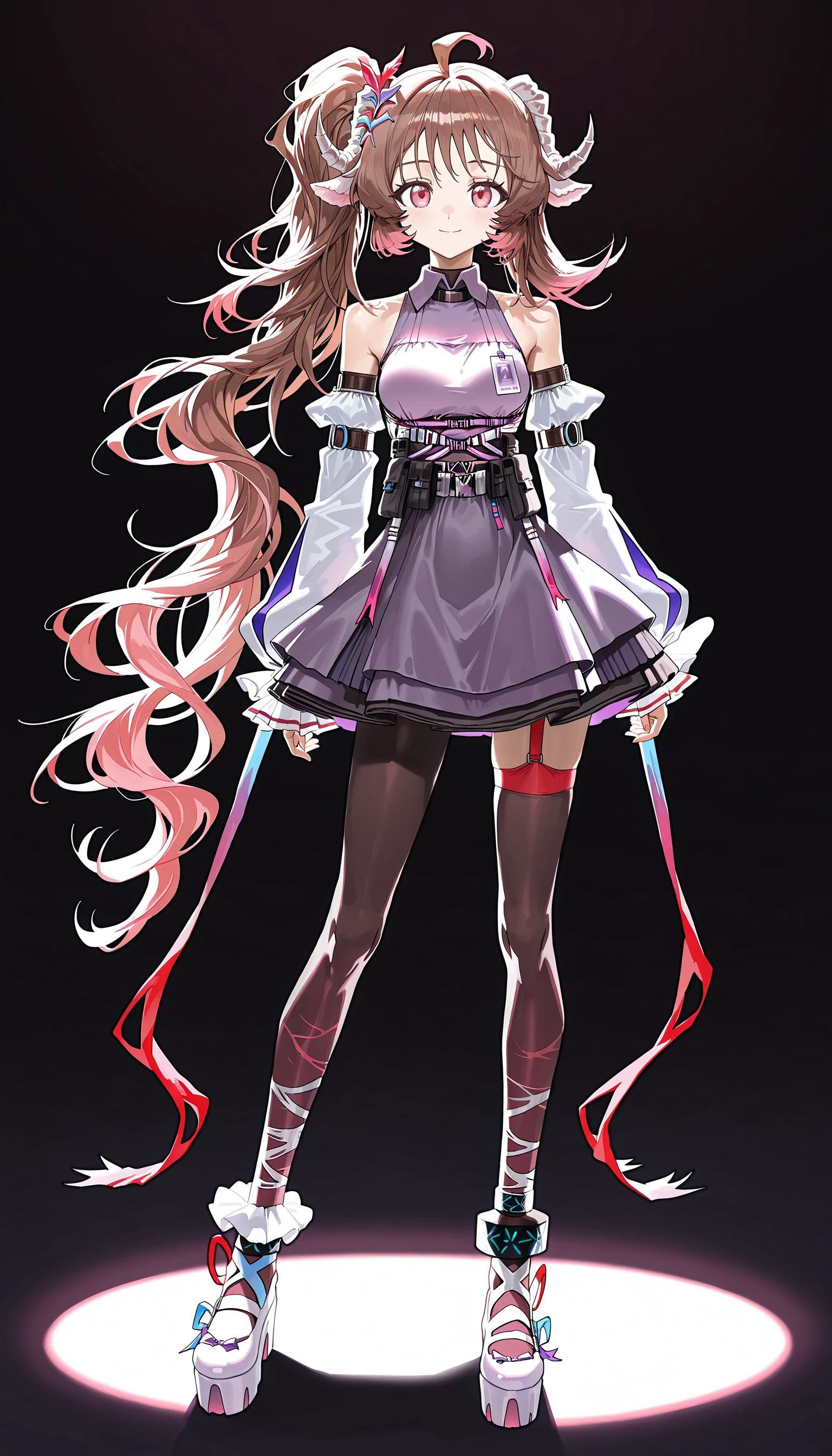 pink eyes, brown hair, sheep horns , ahoge, long high ponytail ,sheep ears,
