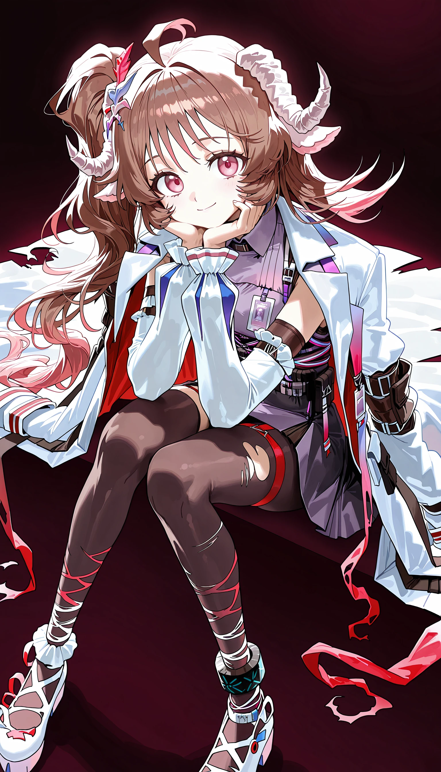pink eyes,brown hair,sheep horns ,ahoge,side ponytail ,
