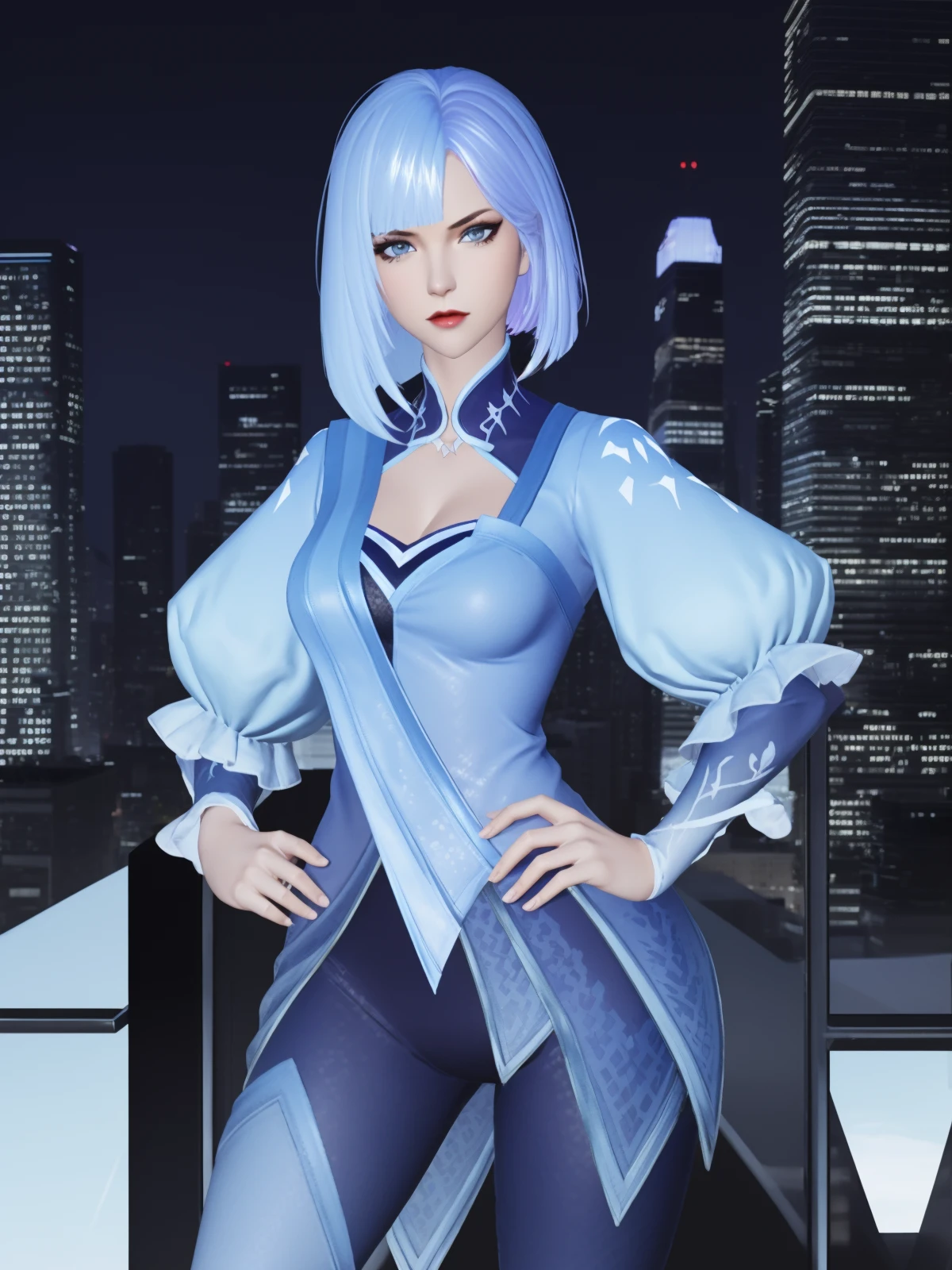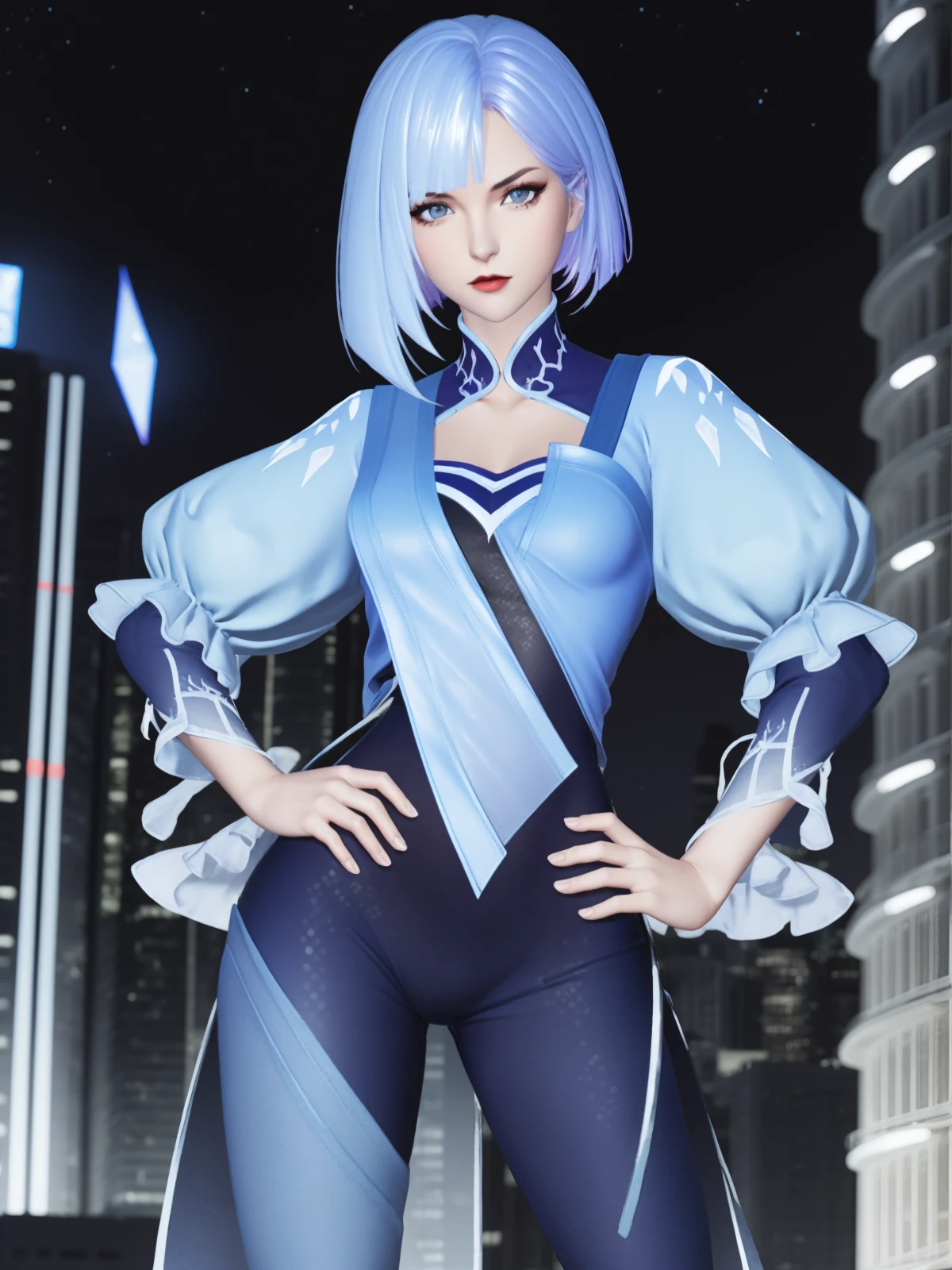WZRYjingBRHJ, 1girl, solo, blue hair, short hair, puffy sleeves, blue eyes, multicolored hair, looking at viewer, long sleeves, bodysuit, breasts, boots, cityscape, night, hand on hip,