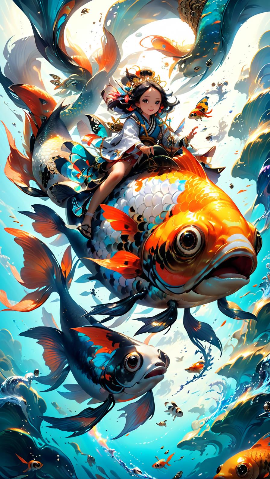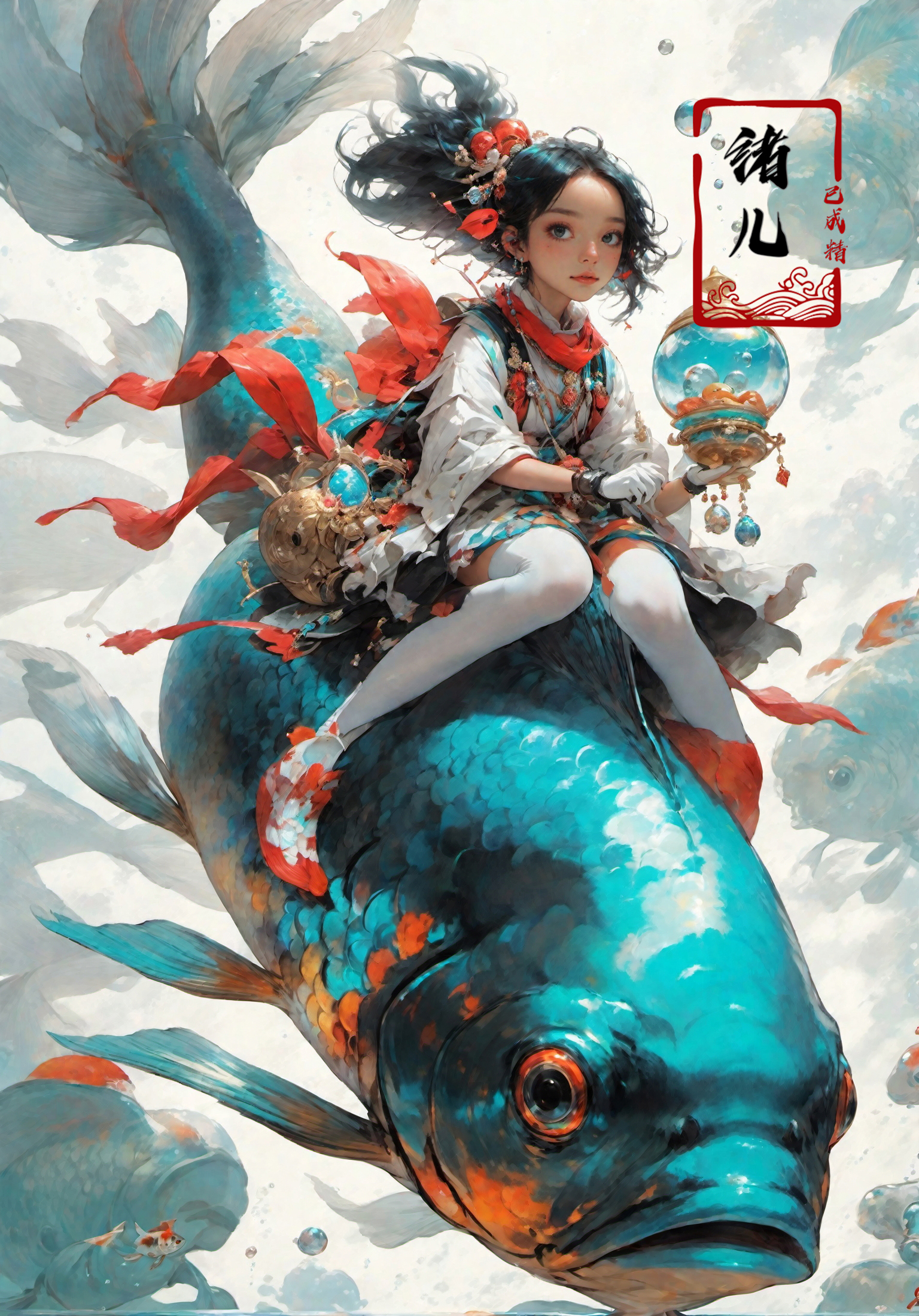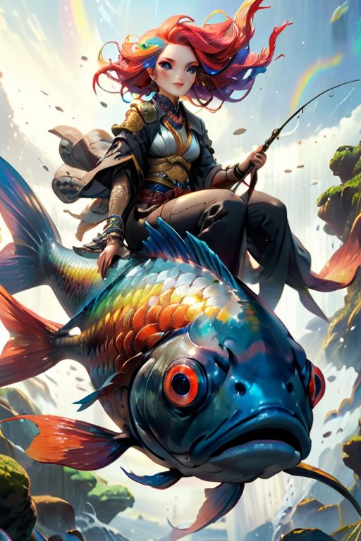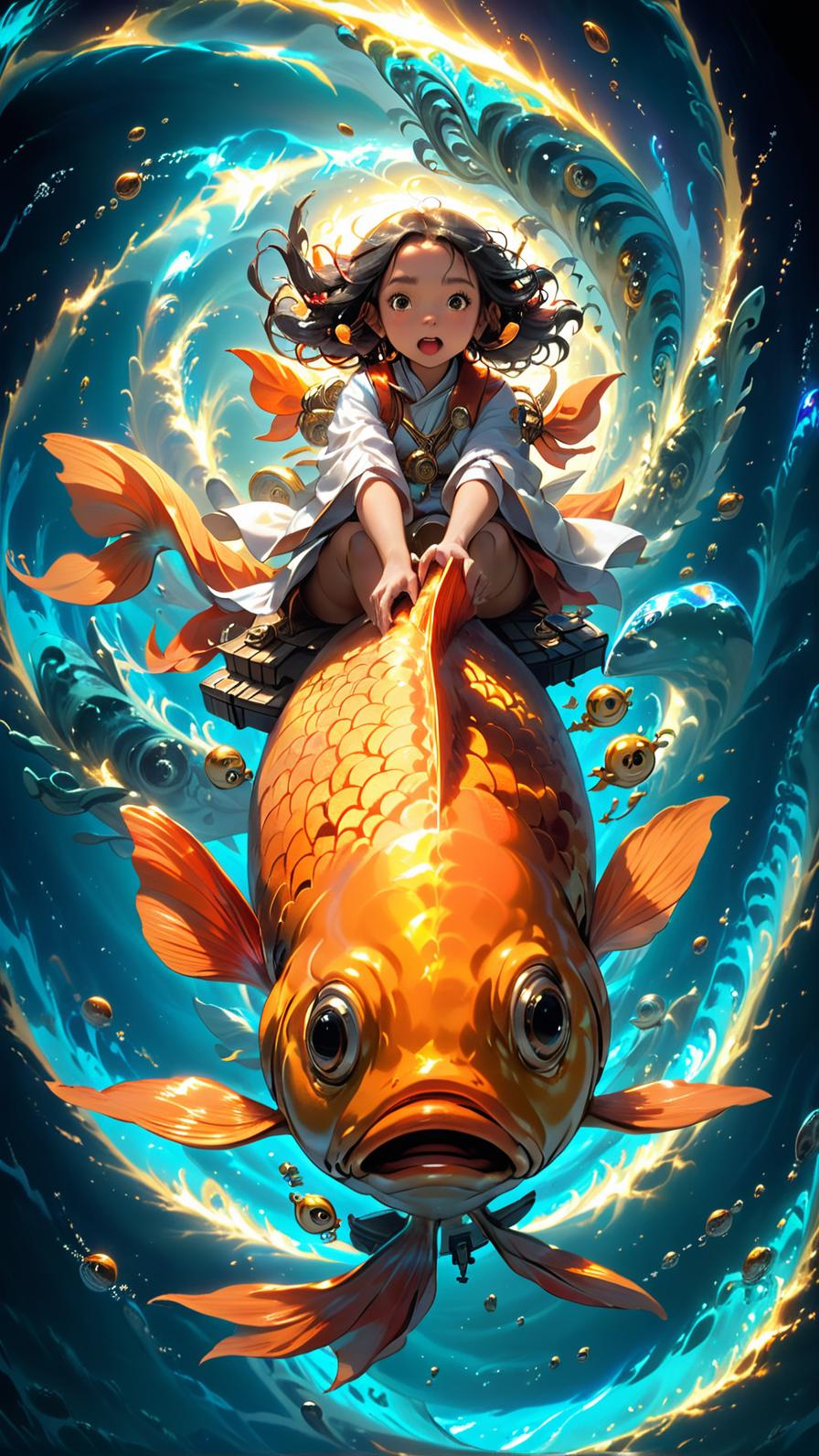 It's an XL version of lora. Provide the composition and painting style of riding big fish.
