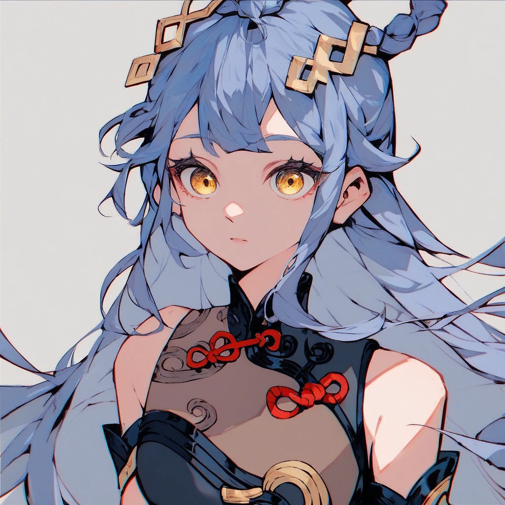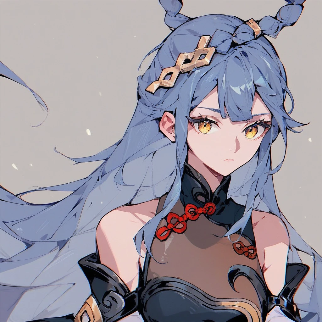 1girl, long hair, hair ornament, dress, bare shoulders, blue hair, yellow eyes, braid, blue dress, chinese clothes, china dress, light blue hair,
