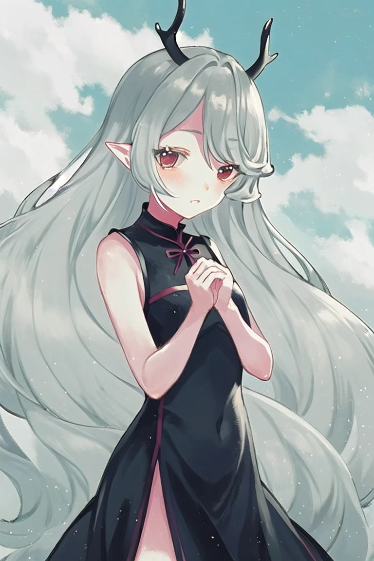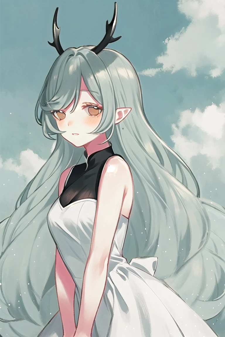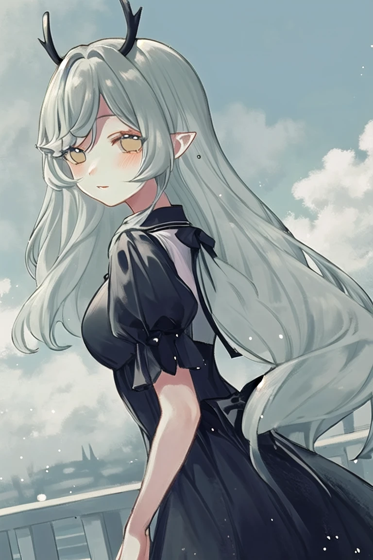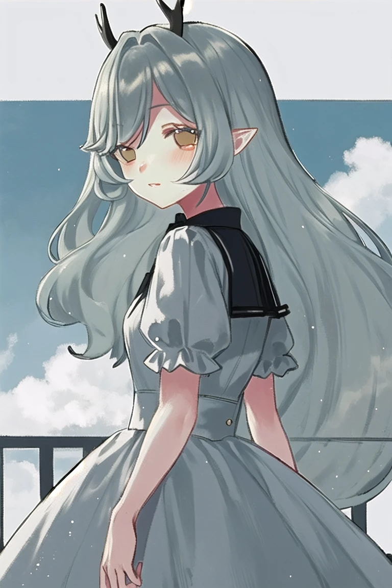 kushui,(antlers),(horns),long hair,grey hair,pointy ears,yellow eyes,parted lips,
