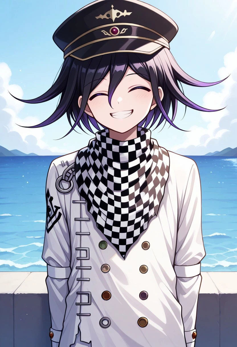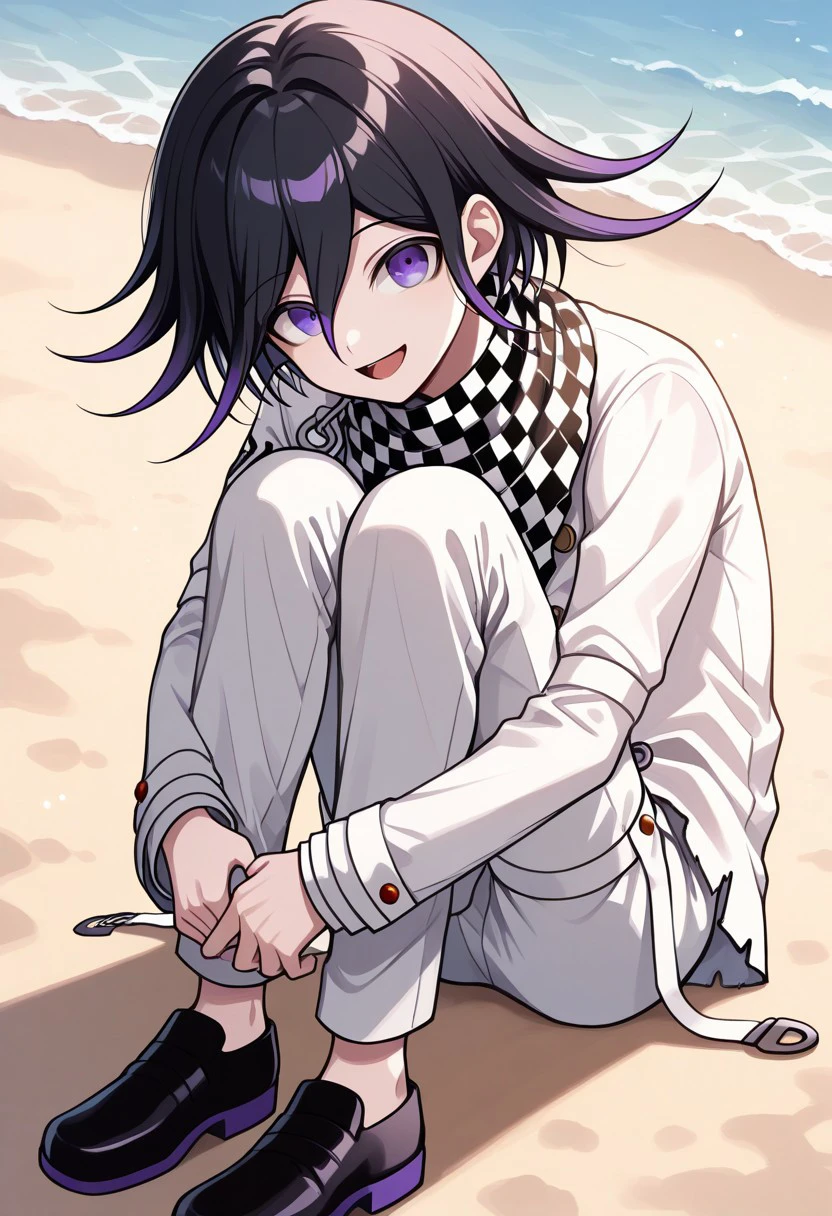 Casual: kokichi, 1boy, purple hair, bangs, purple eyes, straitjacket, scarf, checkered scarf, checkered clothes,