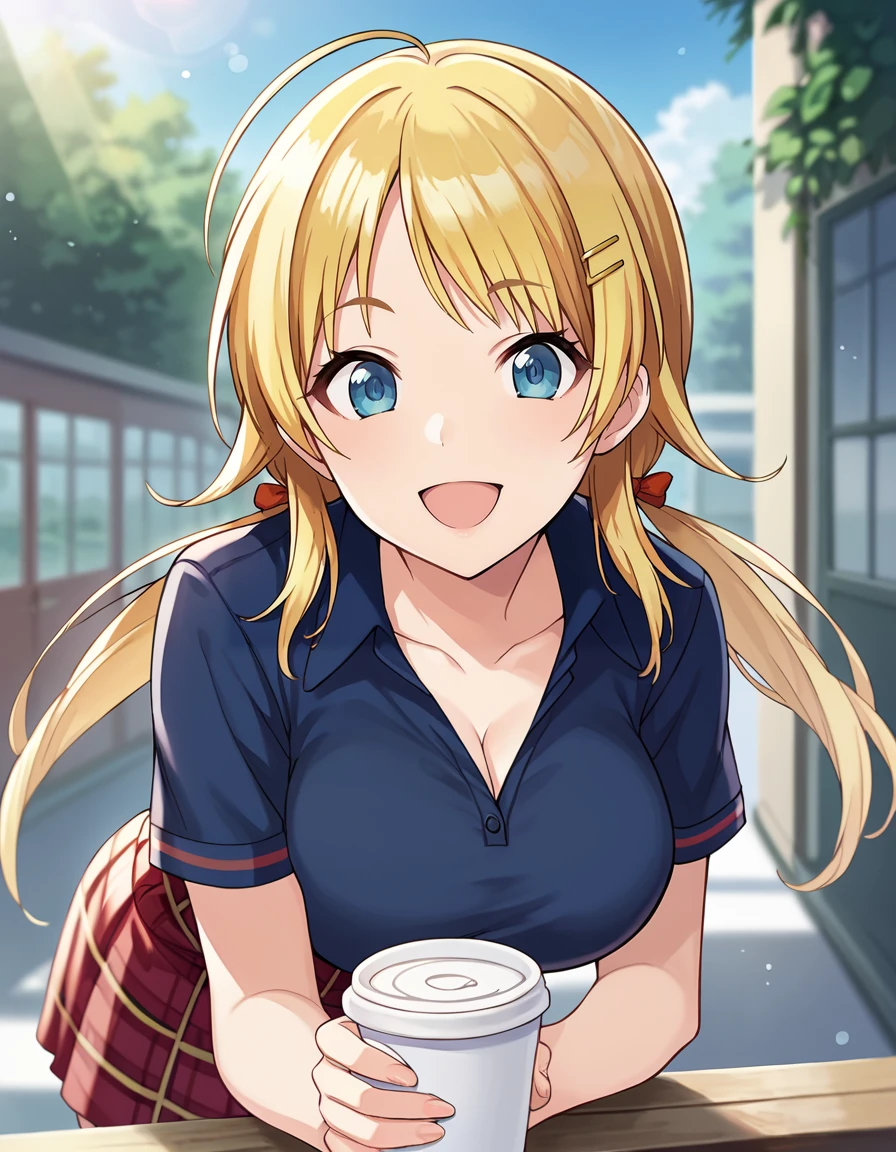 hcmymgr, long hair, blonde hair, low twintails, ahoge, bangs, hairclip, hair ribbon, blue eyes, large breasts,School uniform