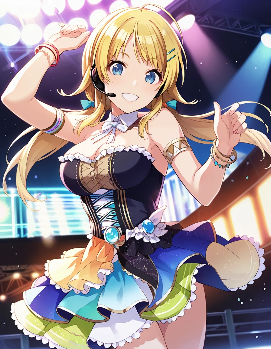 hcmymgr, long hair, blonde hair, low twintails, ahoge, bangs, hairclip, hair ribbon, blue eyes, large breasts,
