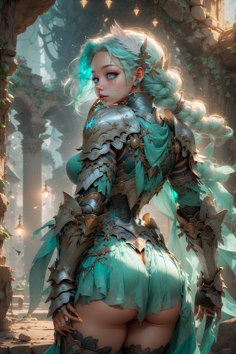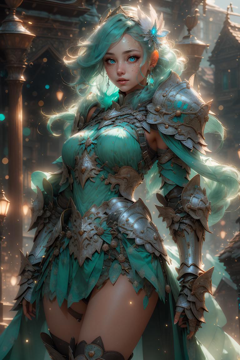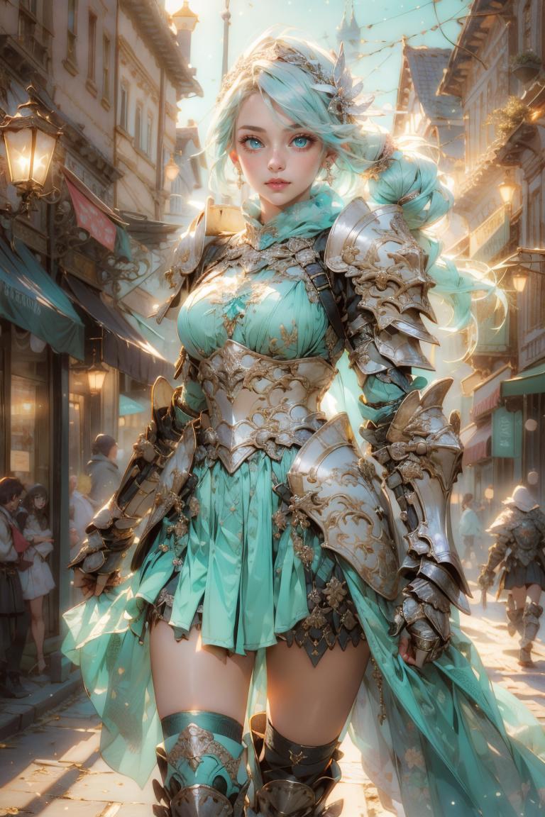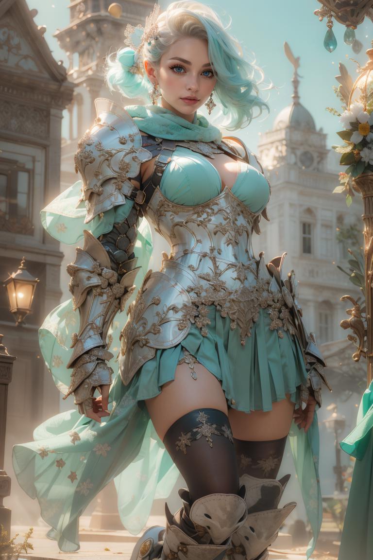 Default: mithrilstylewarrior, shoulder armor, breastplate, aqua eyes, dress, hair ornament, high heel boots, jewelry, earrings, pleated skirt, floating hair