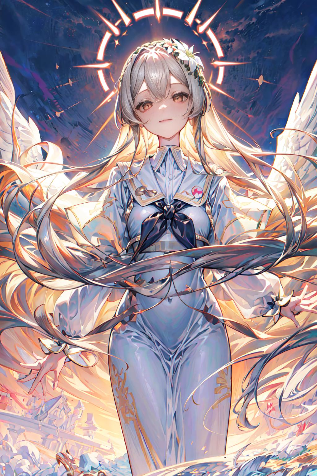 recommended prompt: kirifuji nagisa, long hair, smile, bangs, hair ornament, dress, long sleeves, wings, hair flower, neckerchief, halo