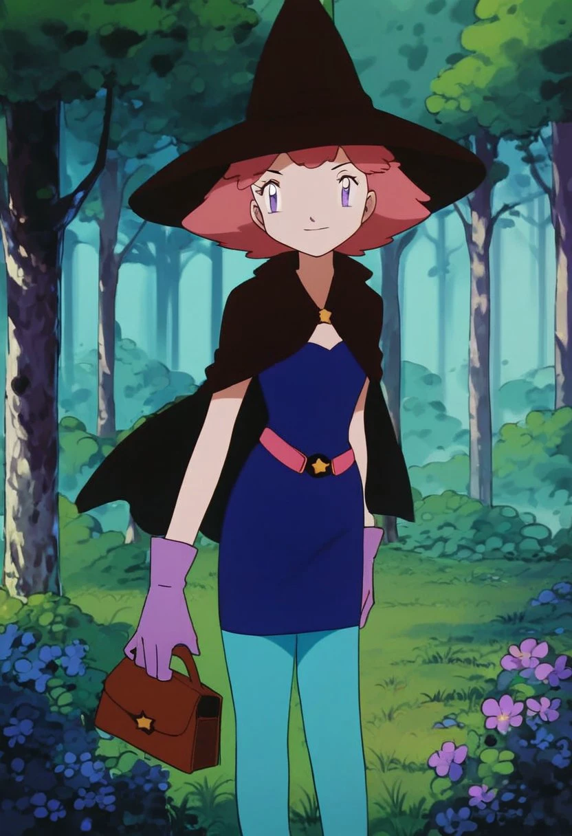 witch hat, gloves, cape, strapless dress, short dress, belt, blue pantyhose