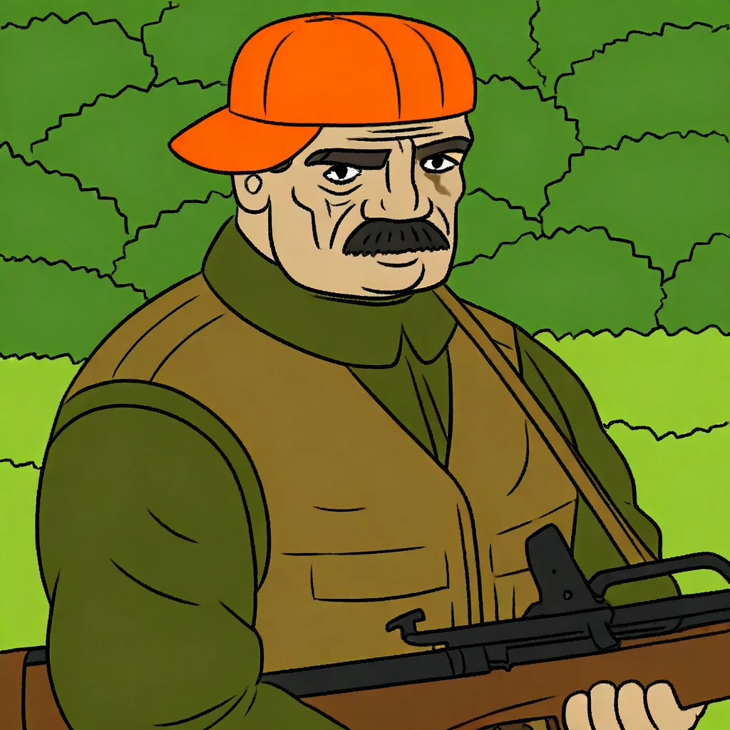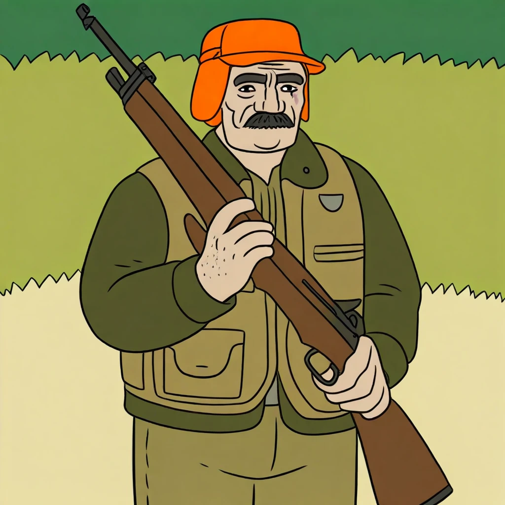 hunting outfit, dark green jacket, olive pants, orange cap, vest, sling