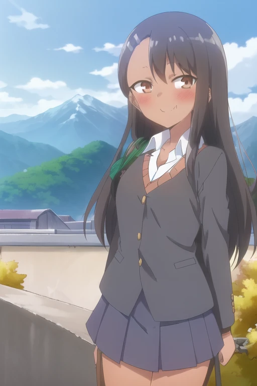nagatoro,black hair,brown eyes,long hair,hair ornament,smile, hairclip,1girl,blush,dark skin,shirt,dark-skinned female,brown hair,white shirt,solo,fang,earclip,school uniform,looking at viewer,skin fang,skirt