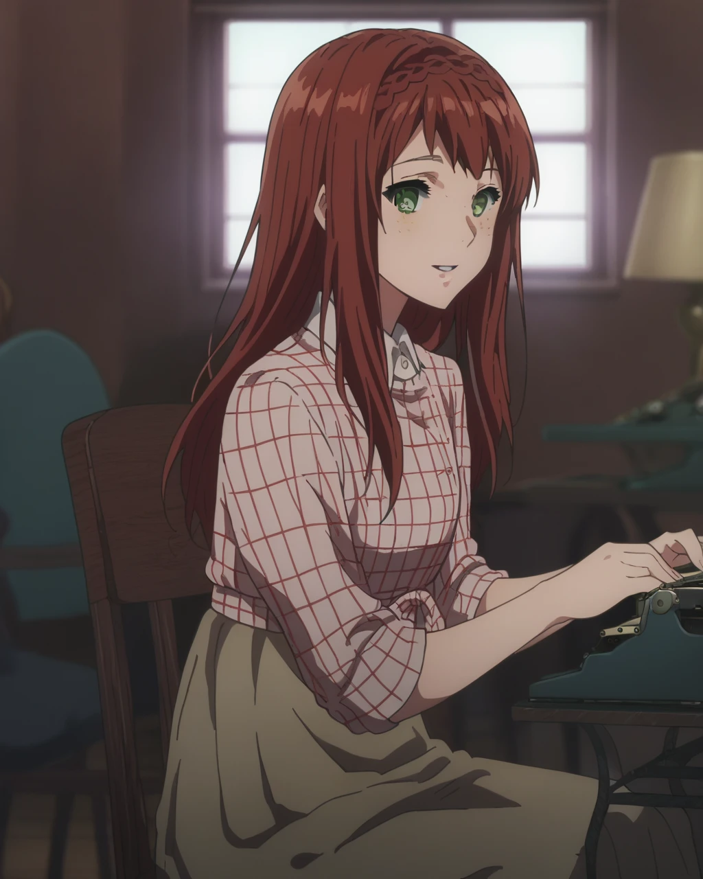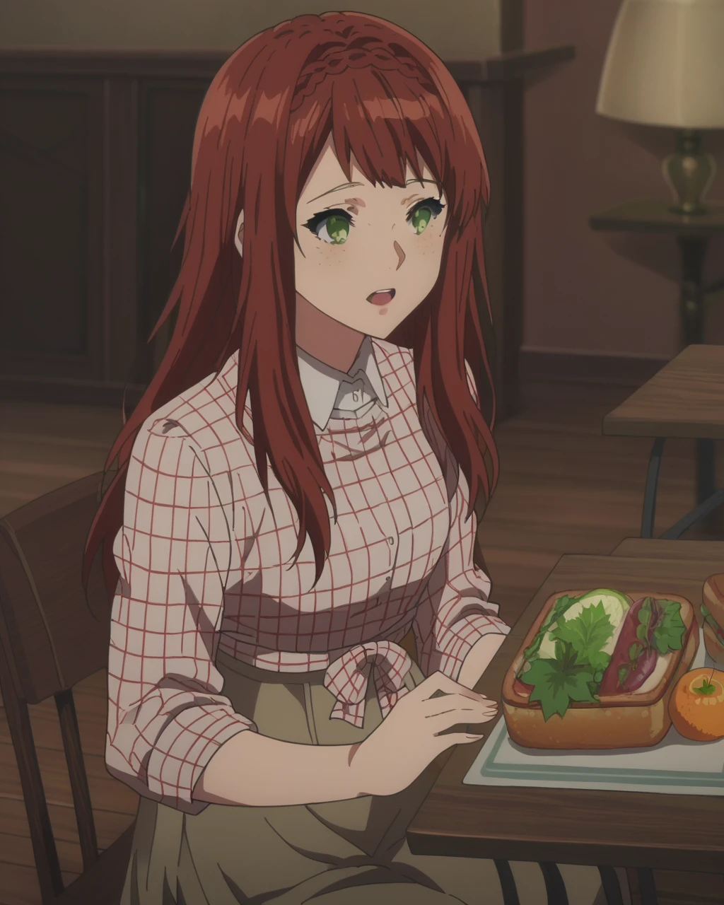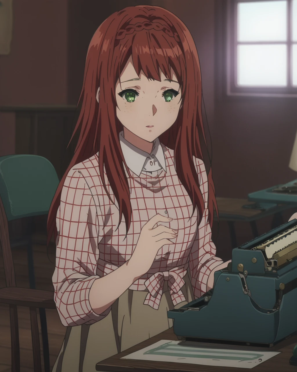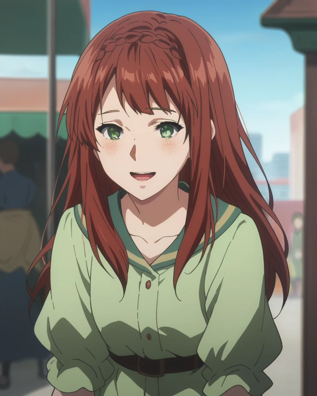 1girl, solo, luculiamarlborough, green eyes, red hair, long hair, bangs, braid, crown braid, freckles,