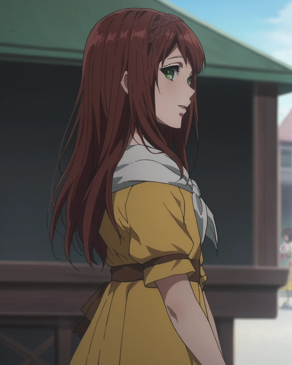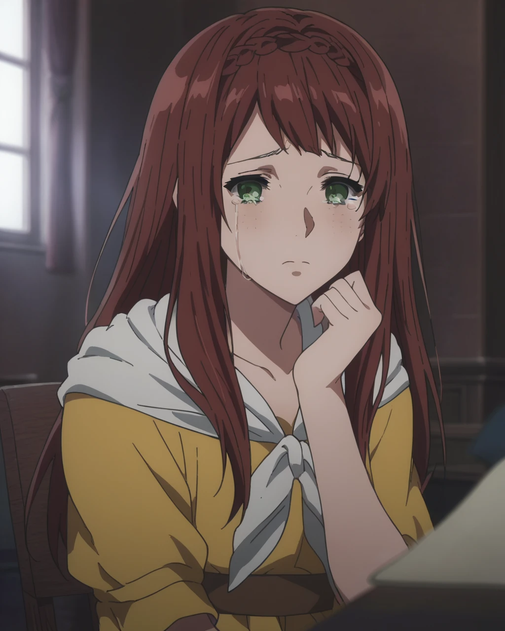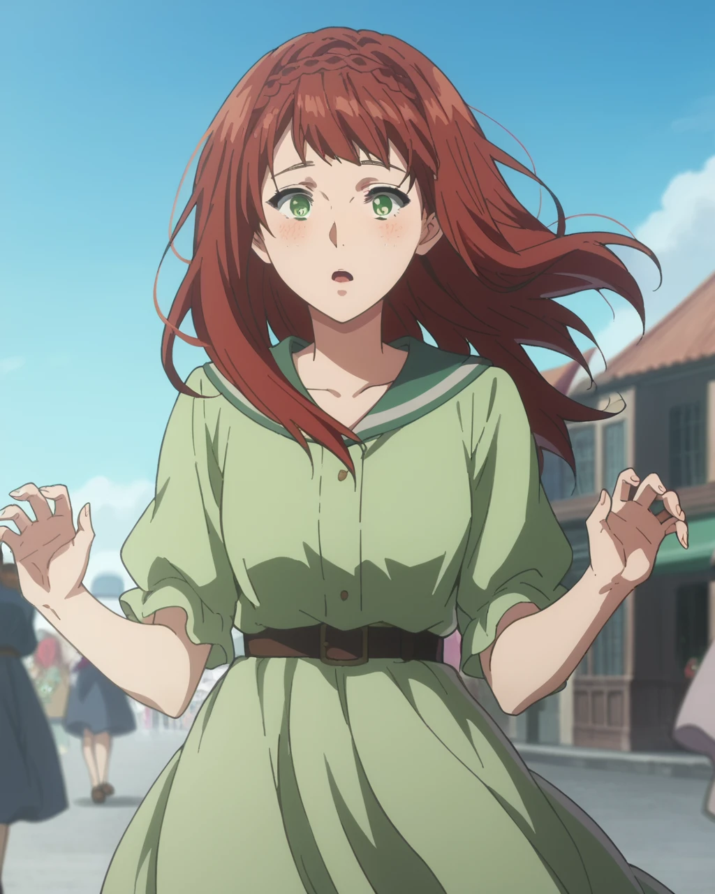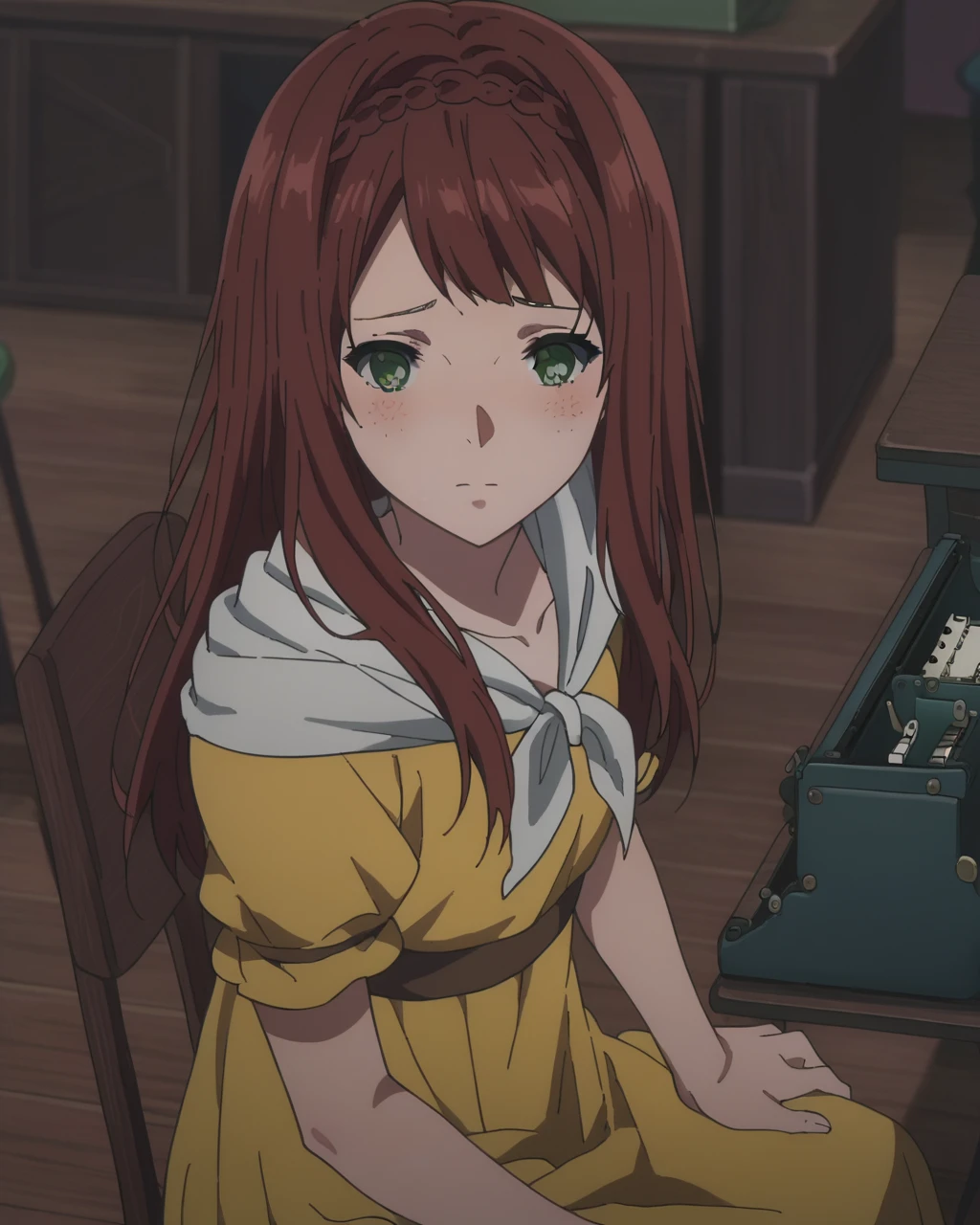 1girl, solo, luculiamarlborough, green eyes, red hair, long hair, bangs, braid, crown braid, freckles,