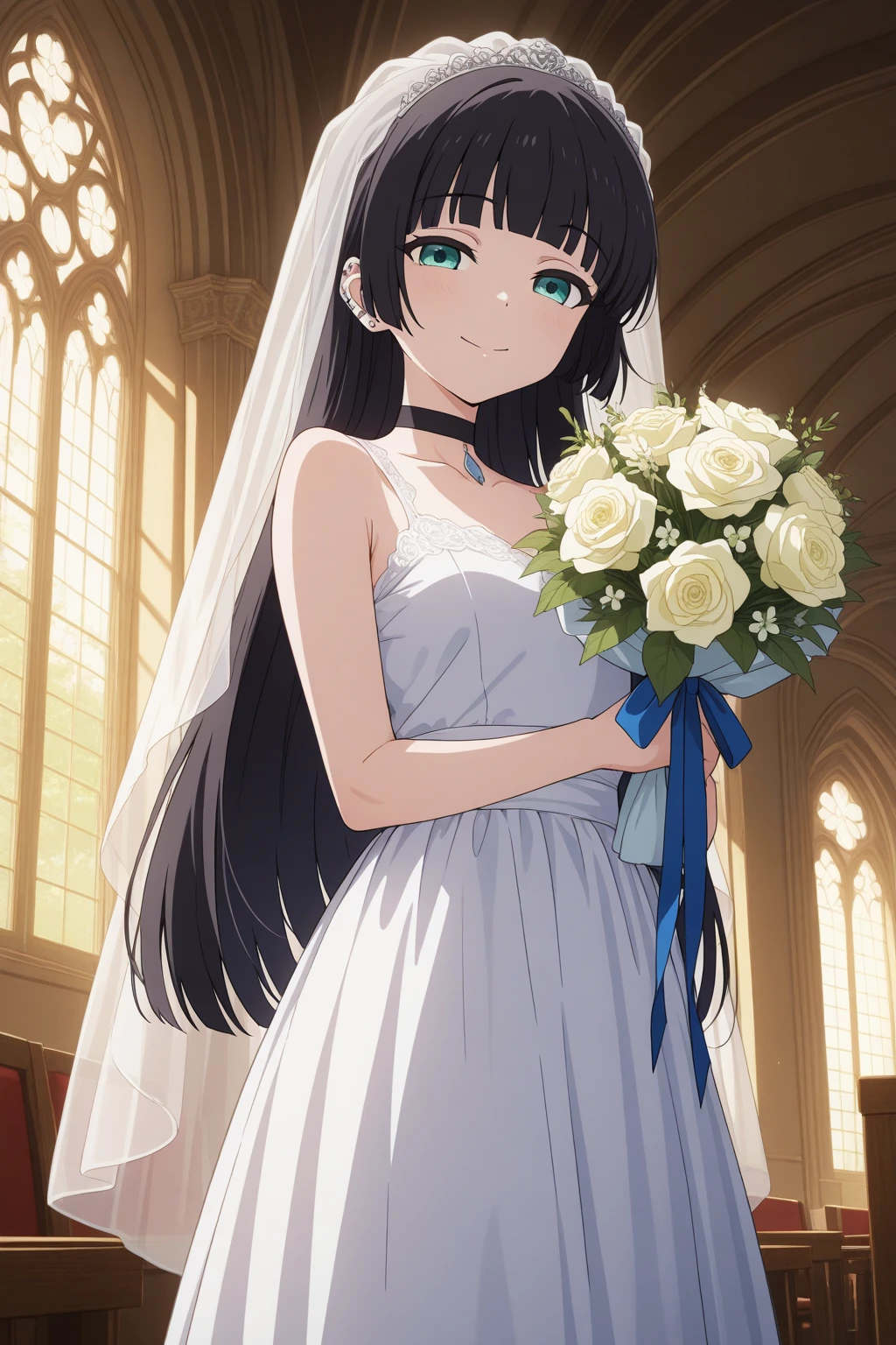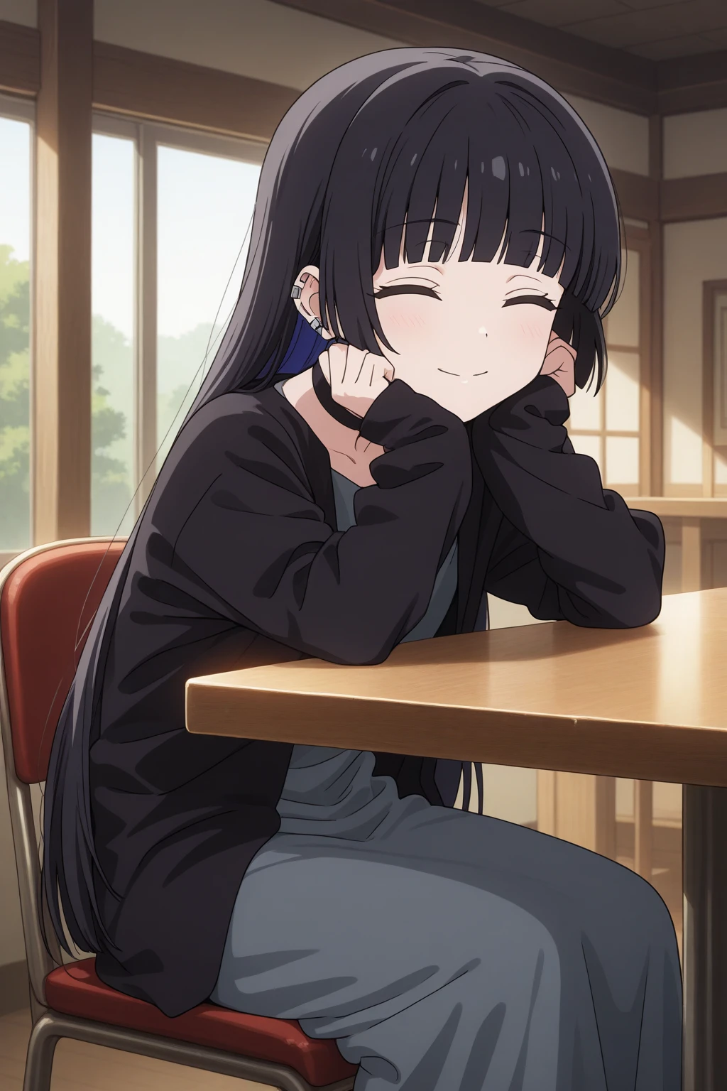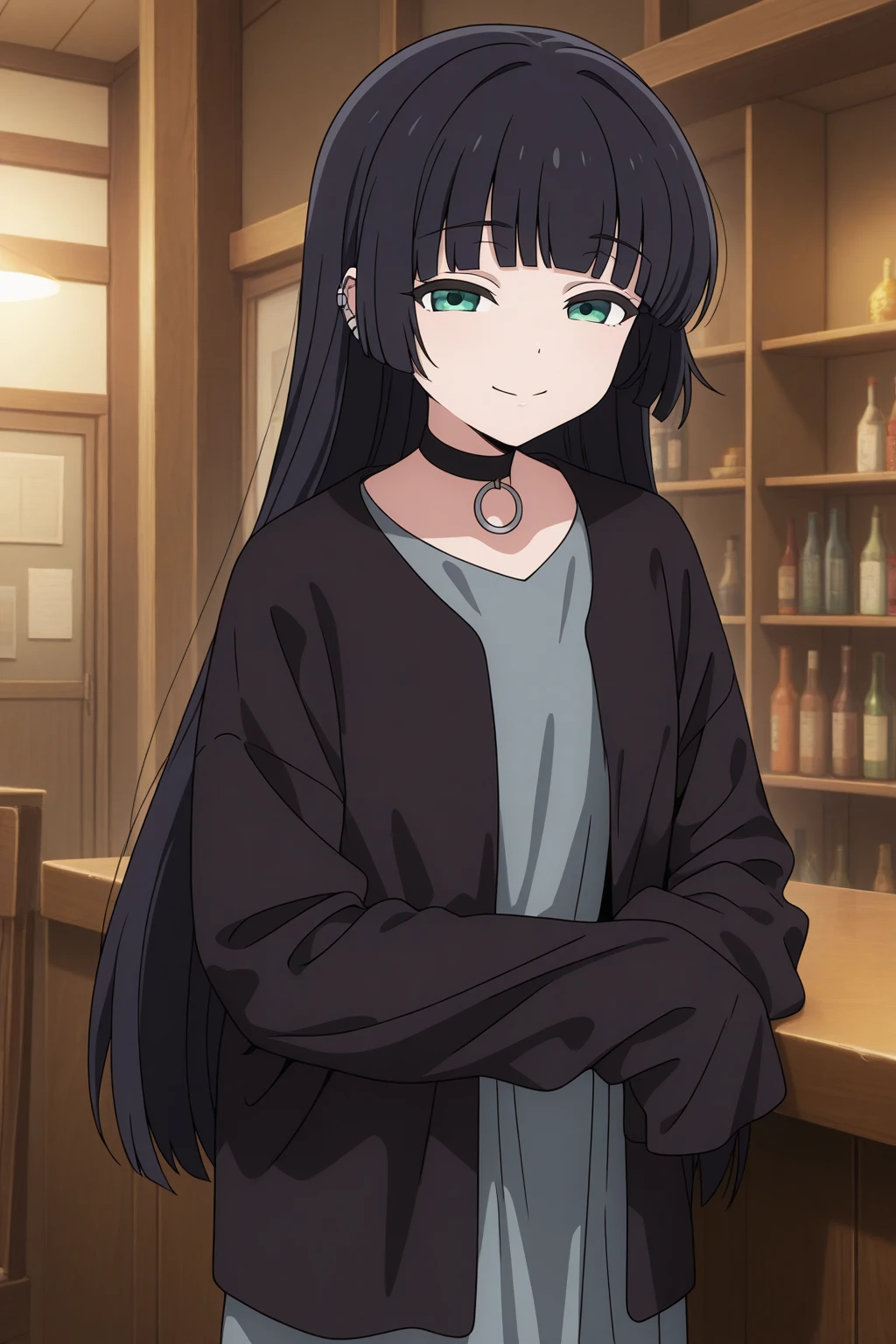 aapa, green eyes, black hair, hime cut, blunt bangs, ear piercing, black choker, padef, grey dress, long dress, black cardigan, sleeves past fingers, anime coloring,