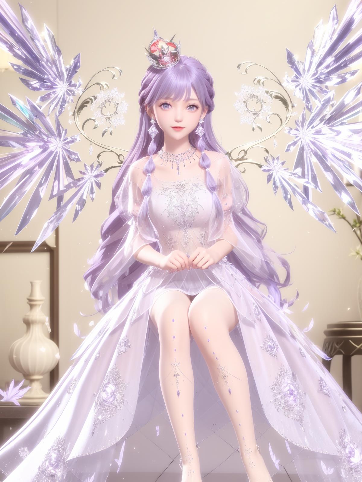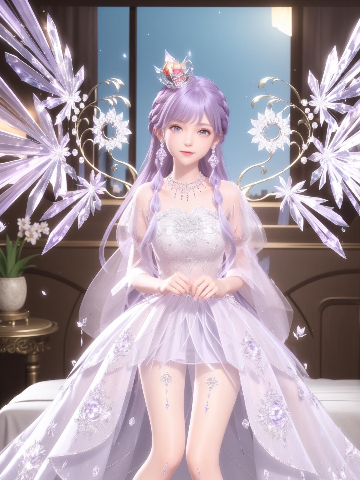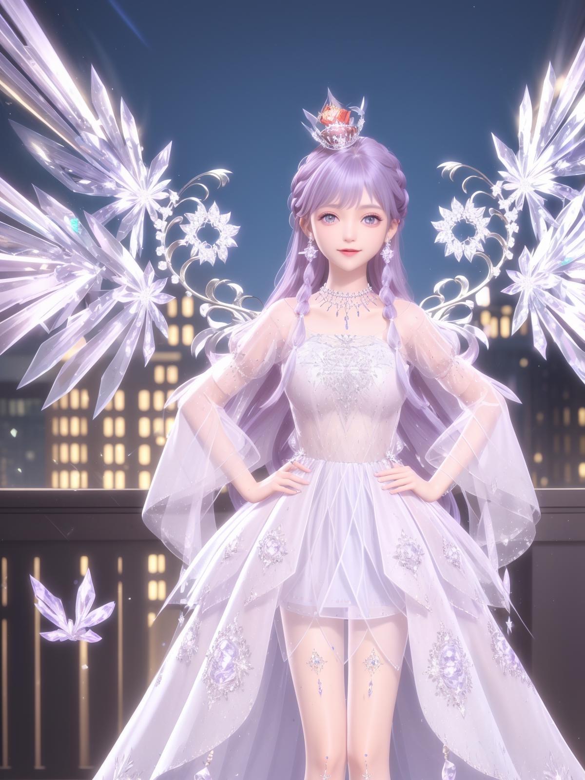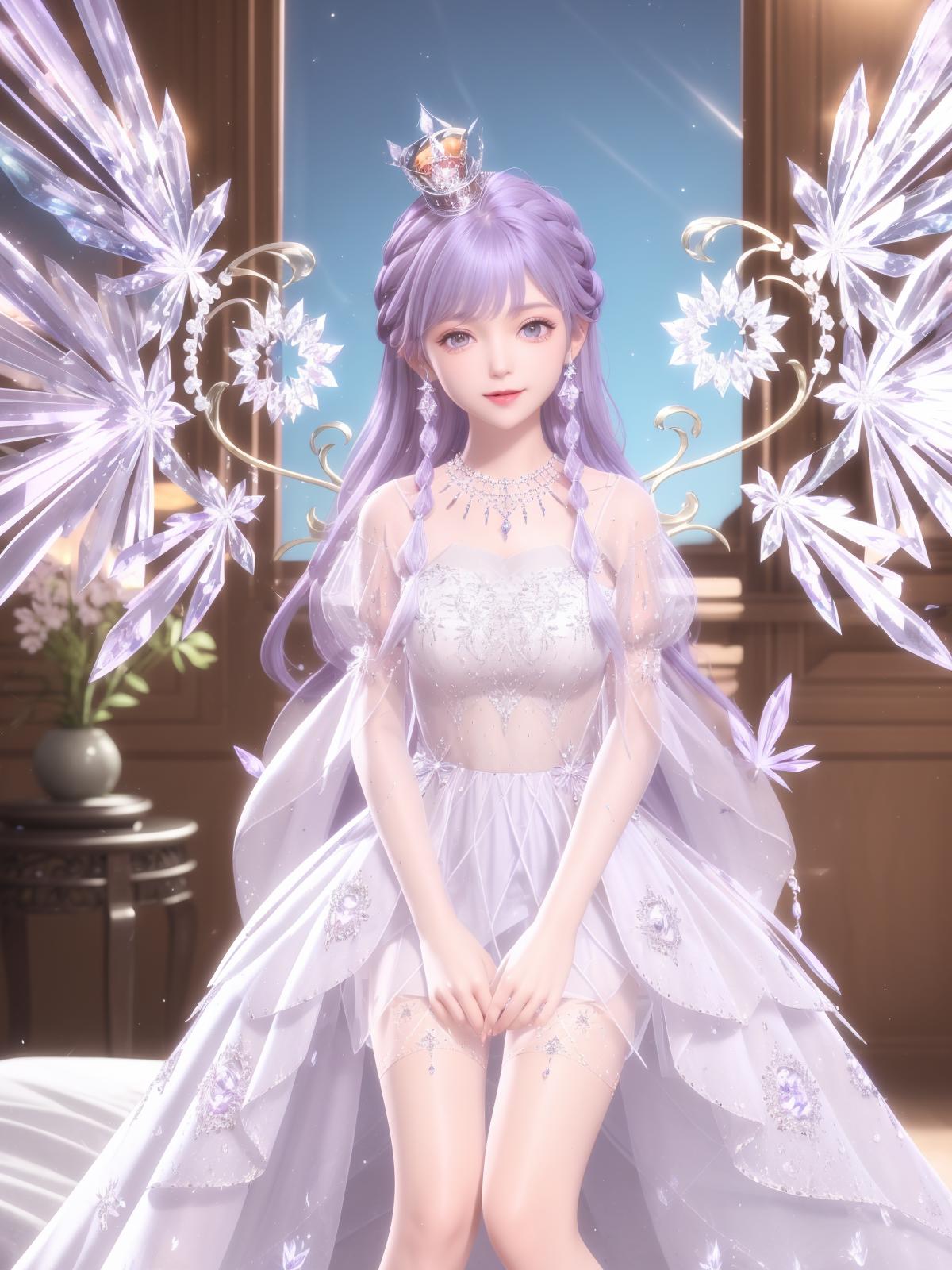 SYNNHQZL, 1girl, solo, dress, long hair, jewelry, crown, necklace, crystal, purple hair, see-through, looking at viewer, earrings, smile, hair ornament, purple eyes, braid,wings, cityscape, night, mature female,sitting, bed,
