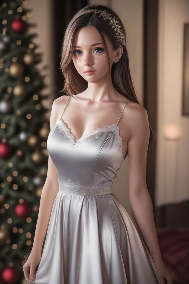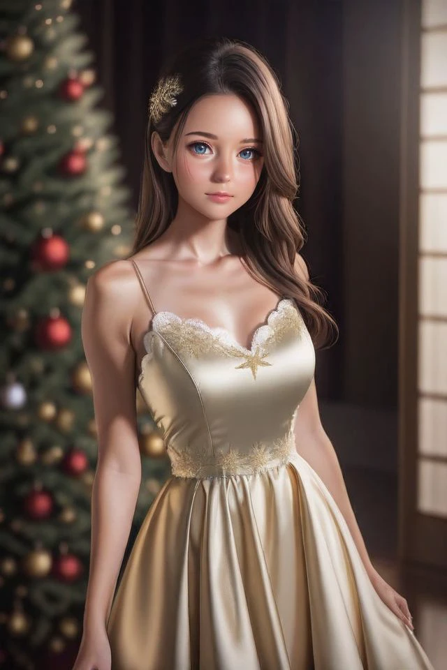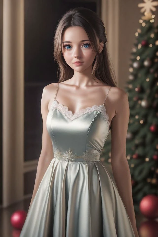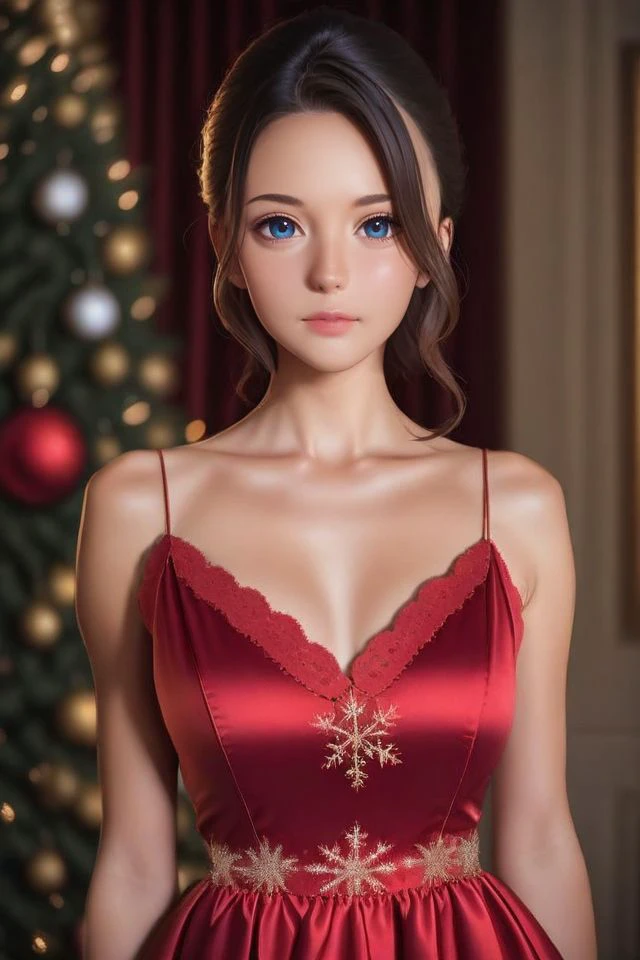 (masterpiece:1.3, realistic:1.3), best quality, ultra detailed, intricate, professional photography, HDR, High Dynamic Range, (8k UHD), RAW photo, dslr, realistic LUT, cinematic LUT, perfect lighting, professional lighting, cinematic lighting, cinematic shadows, iridescent lighting, 1girl, wearing a red ball gown adorned with golden snowflakes and intricate white lace trim, festive holiday background with a beautifully lit Christmas tree, soft focus background, studio lighting, looking at viewer, photorealistic, collarbone accentuated, depth of field, elegant holiday dress design, solo