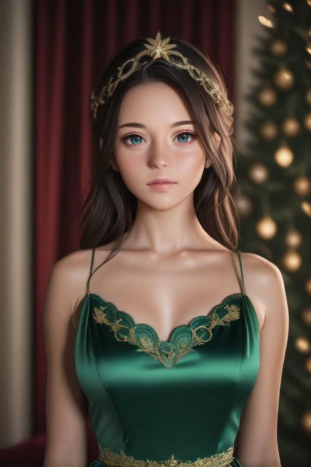 (masterpiece:1.3, realistic:1.3), best quality, ultra detailed, intricate, professional photography, HDR, High Dynamic Range, (8k UHD), RAW photo, dslr, realistic LUT, cinematic LUT, perfect lighting, professional lighting, cinematic lighting, cinematic shadows, iridescent lighting, 1girl, wearing a green velvet ball gown with shimmering golden embroidery and delicate red lace accents, festive holiday background with garlands and sparkling lights, soft focus background, studio lighting, looking at viewer, photorealistic, collarbone accentuated, depth of field, elegant holiday dress design, solo