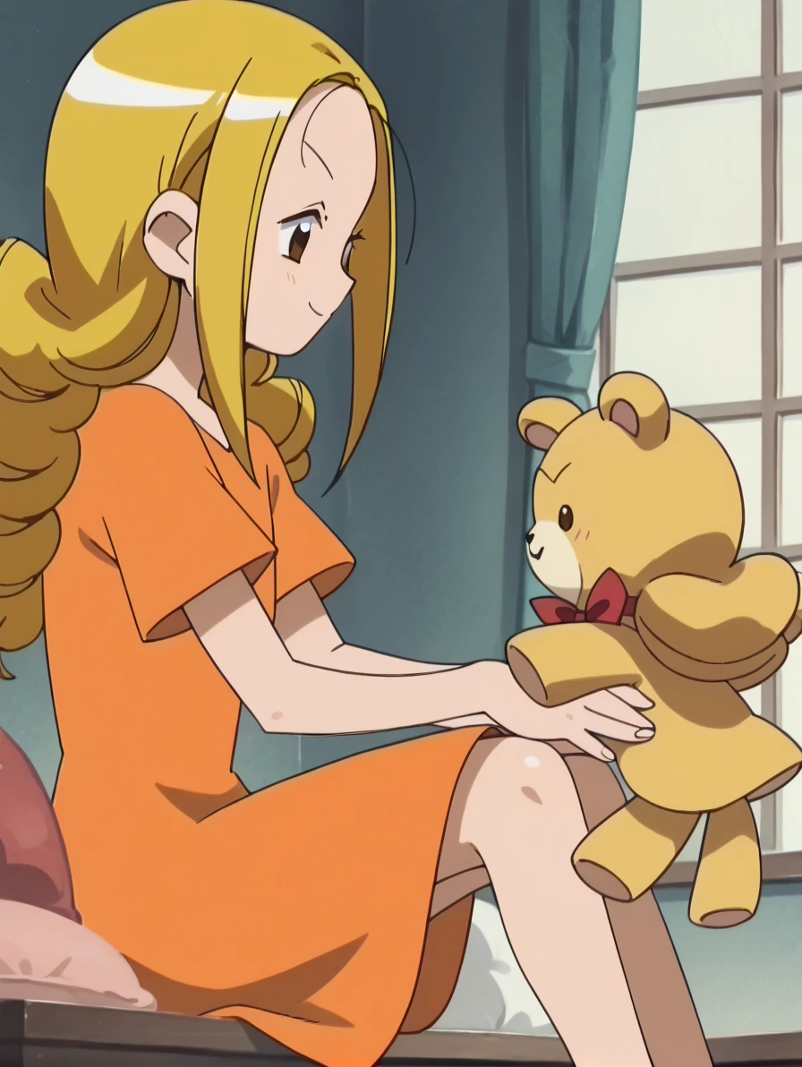 Trigger word: ojatamakir, long hair, blonde hair, brown eyes, orange dress, short sleeves