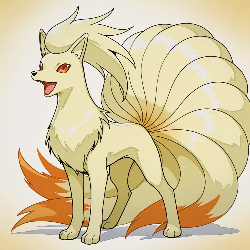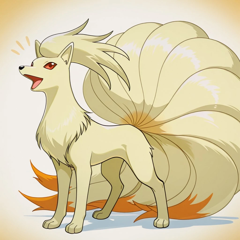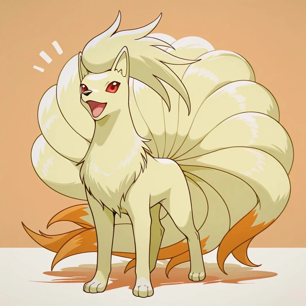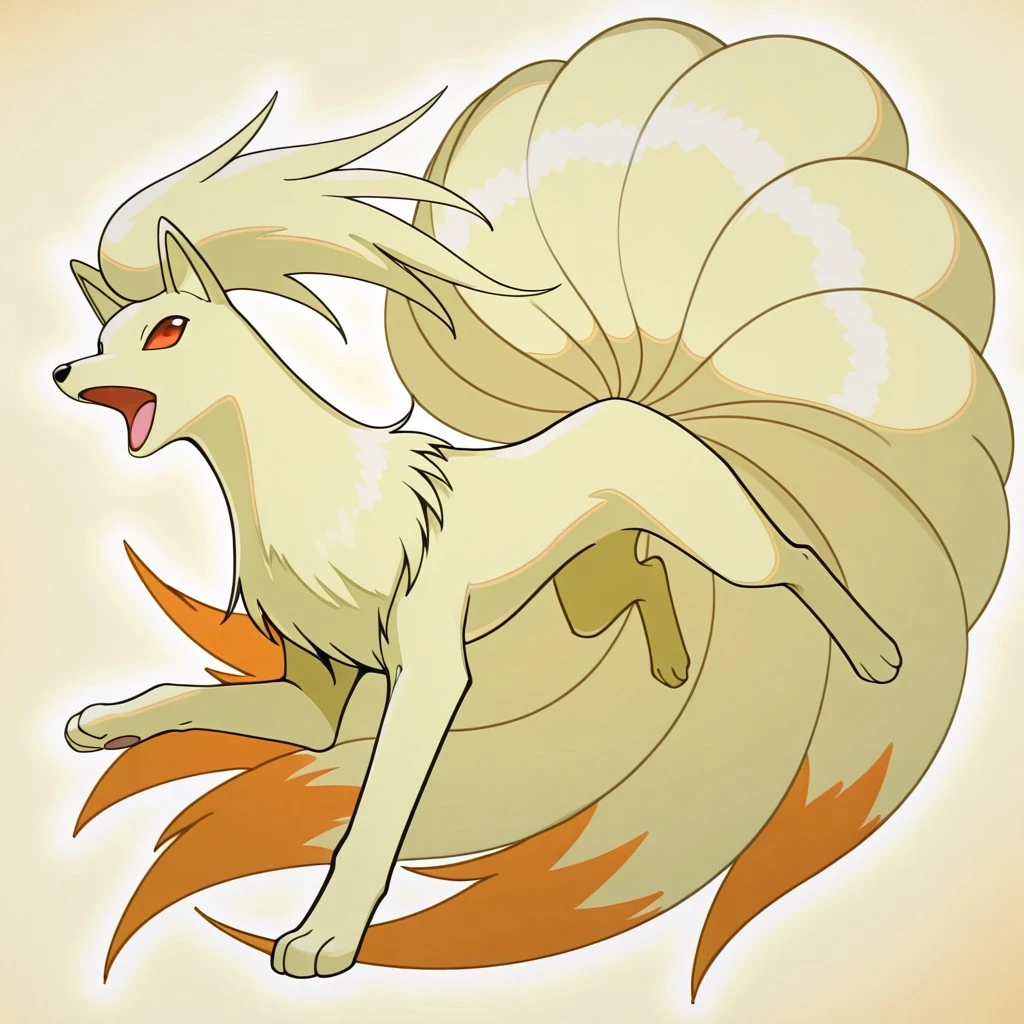 ninetales, pokemon (creature), light yellow fur, fox, nine tails, orange tail tips, quadruped, red eyes