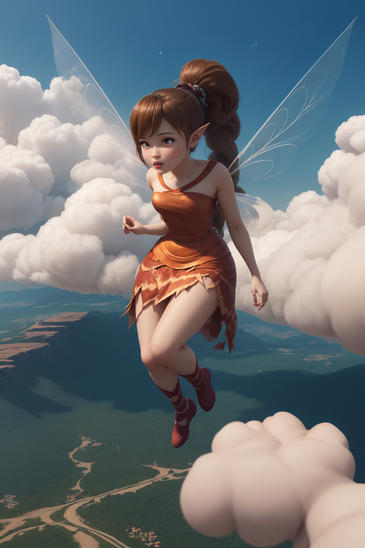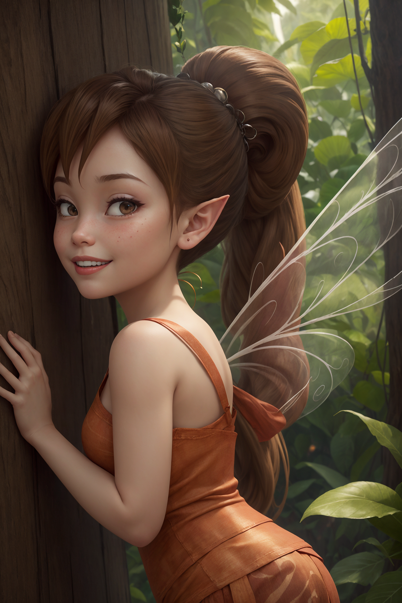 • Fawn, long wings, brown clothes, extra long ponytail, pointy ears, brown eyes,