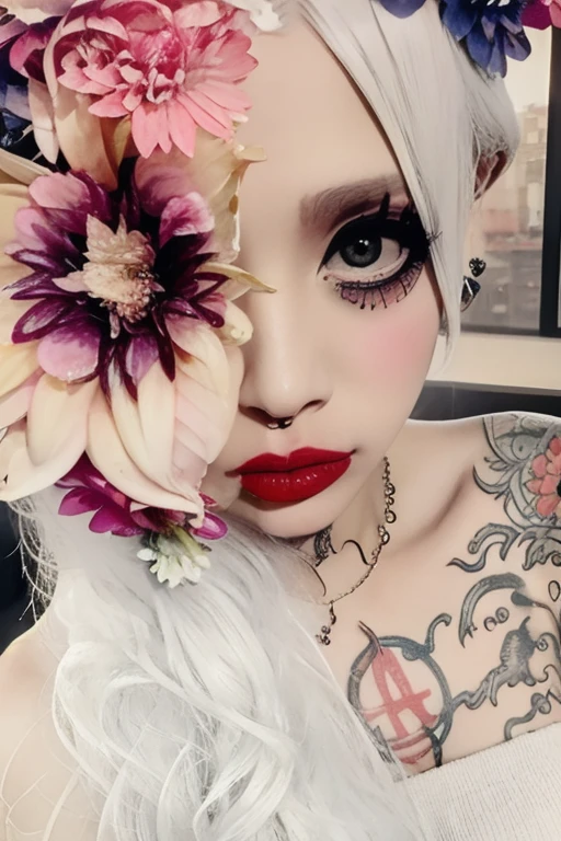 m3t0, long hair, white hair, flower covering the eye, makeup, gray eyes, red lipstick, tattoo, black dress, exposed shoulders