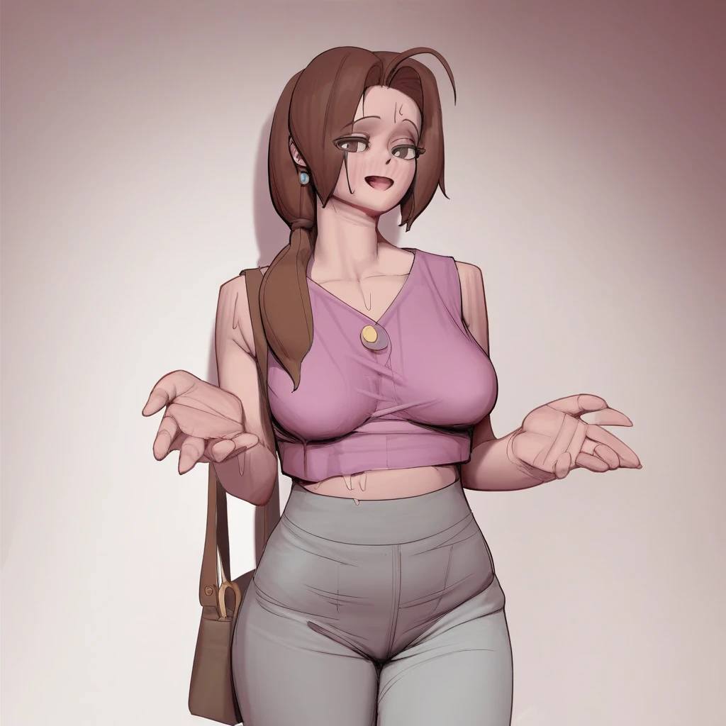 grey pants, pants, crop top, sports bra, midriff, navel, cleavage, yoga pants