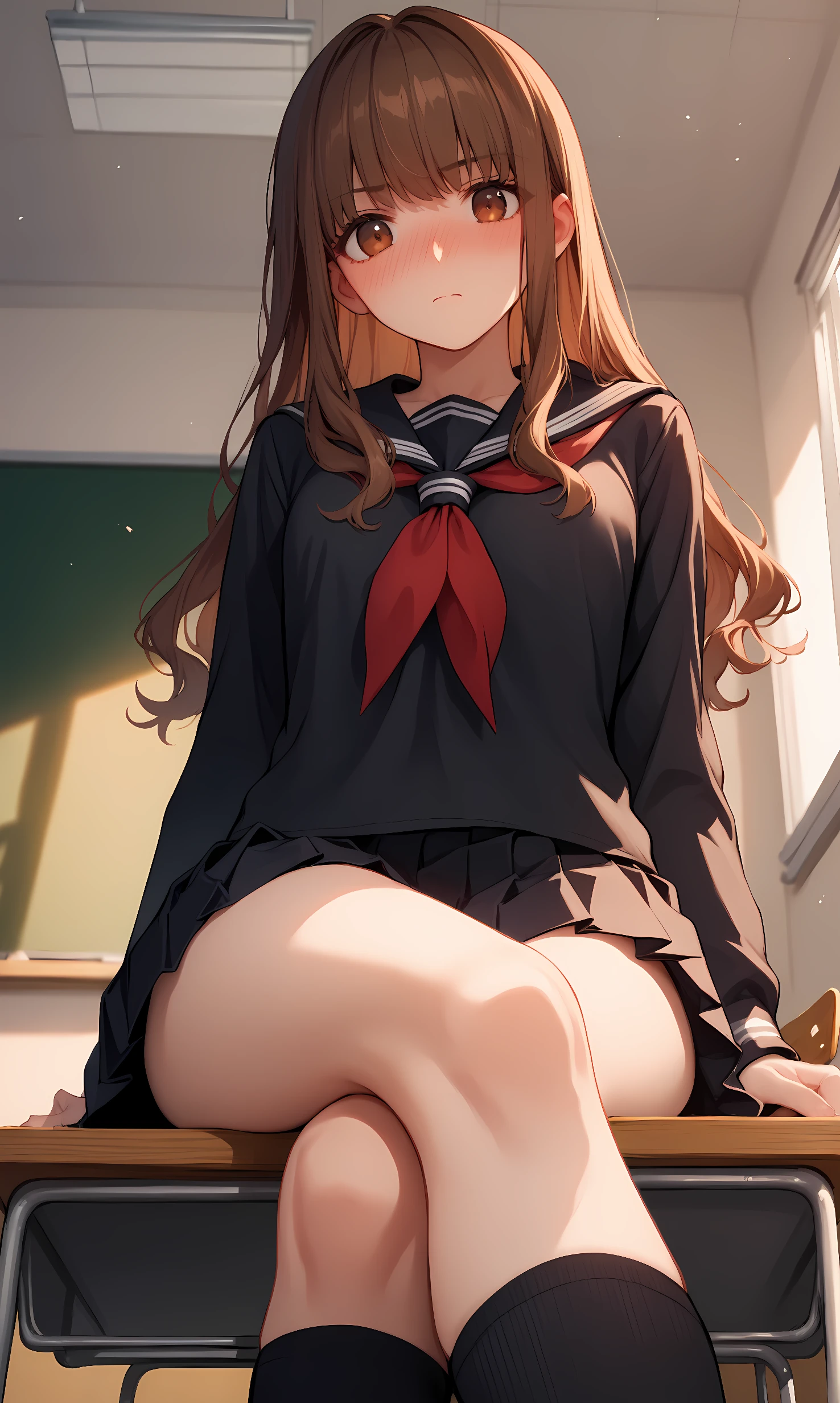 brown blazer, long sleeves, blue bowtie, brown skirt, pleated skirt, black pantyhose, brown shoes, black turtleneck