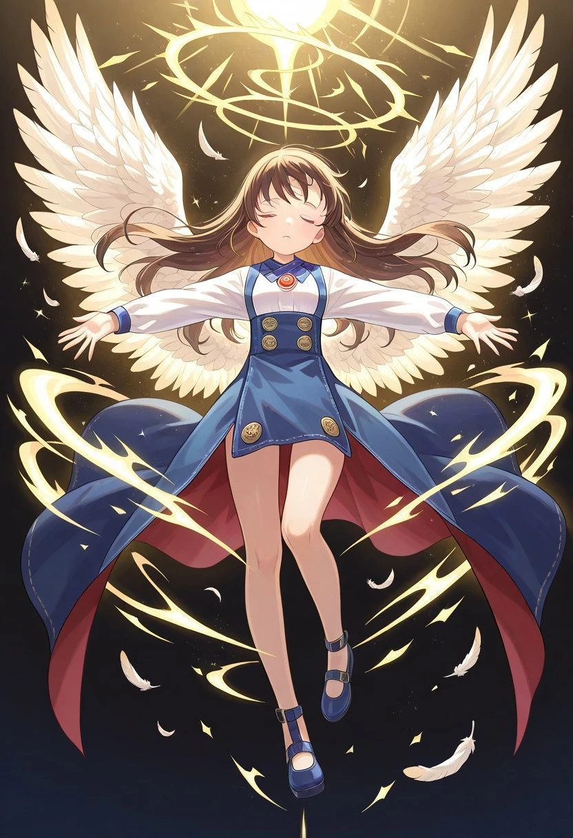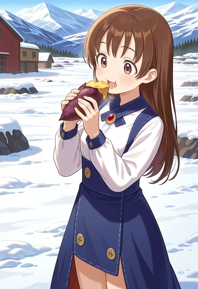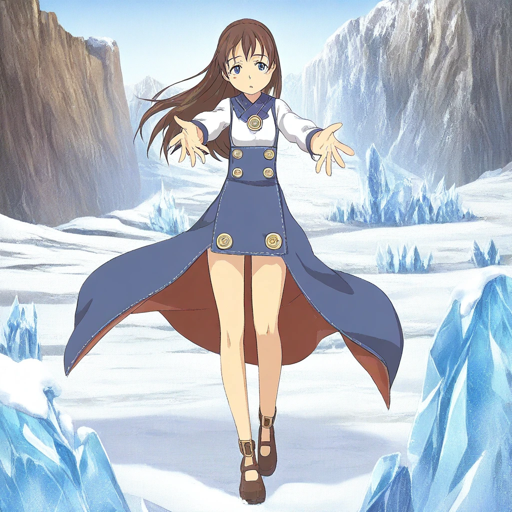 Prompt: Amer_SN2, long hair, bangs, brown hair, green eyes, shirt, brooch, dirndl, long sleeves, white sleeves, sleeve cuffs, overall skirt, overskirt, buttons, bare knees, legs, shoes, ankle strap, blue footwear