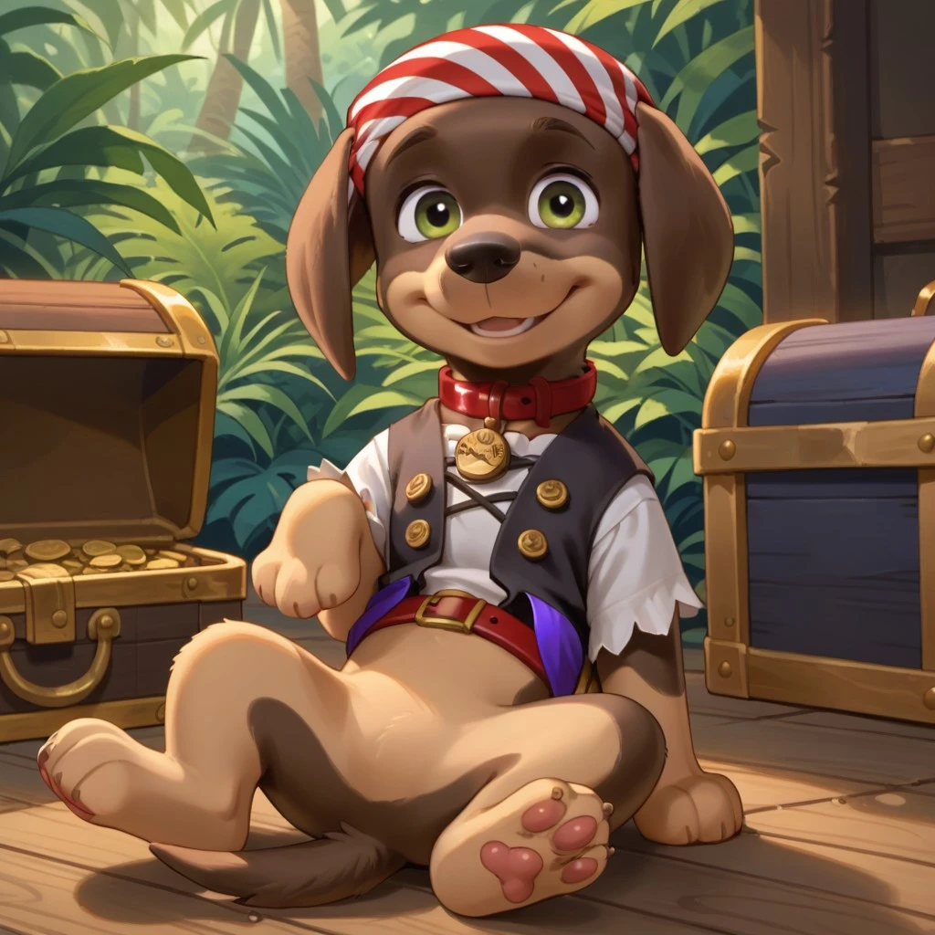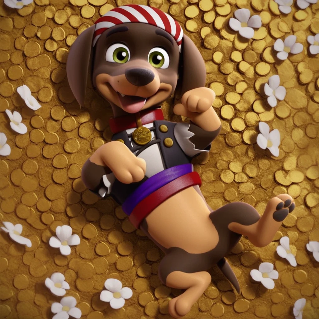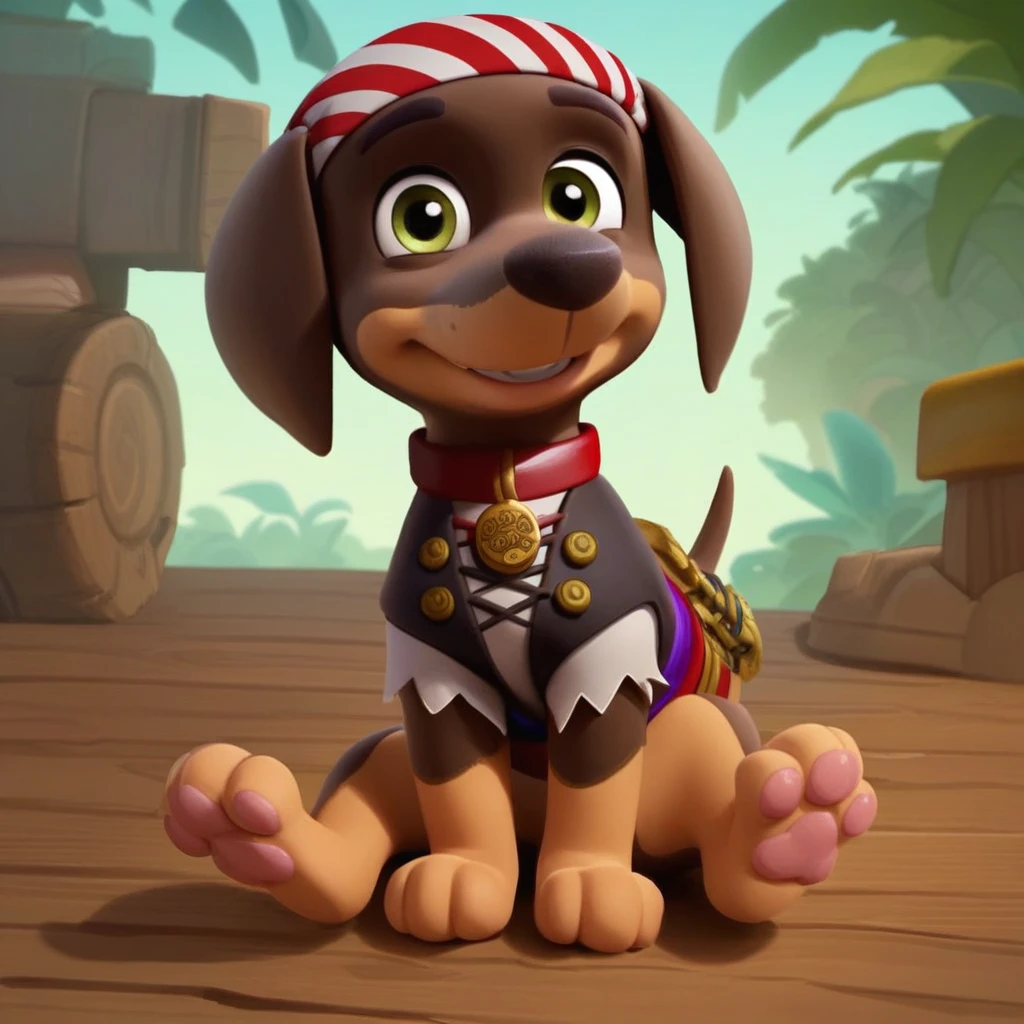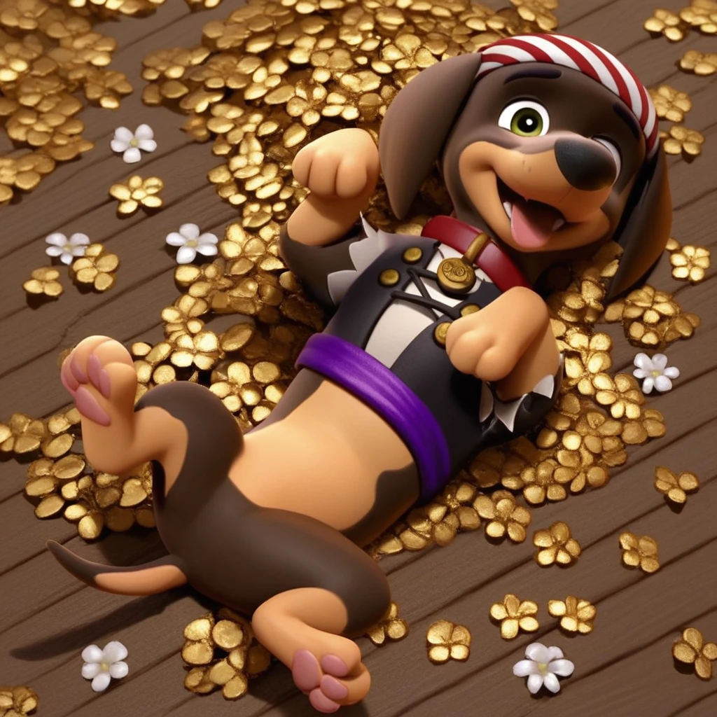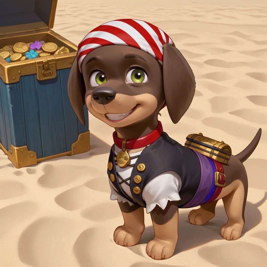 dog, dachshund, black and brown fur, dark green eyes, black nose, dog ears, dog tail, pirate attire, red collar, gold dog tag, white under shirt, brown vest, gold buttons, red and white striped cap, wooden chest on back,