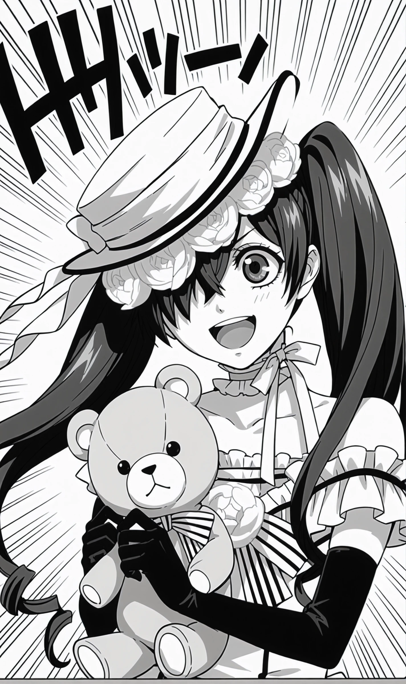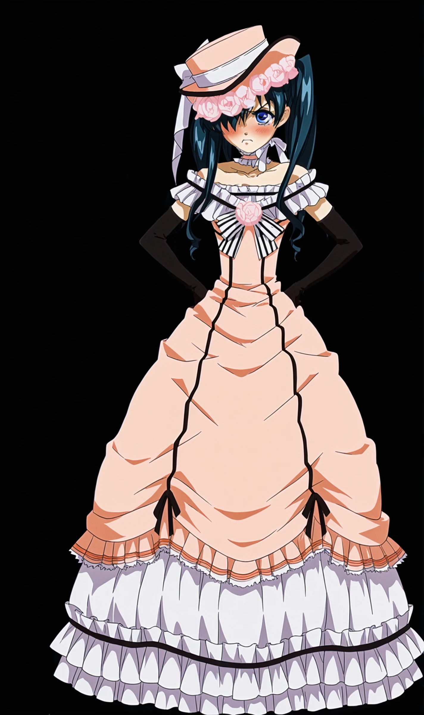 Main Outfit-'blue hair, long hair, twintails, blue eye, hair over one eye, pink hat, pink ?????????? shoulder, choker, black elbow gloves'