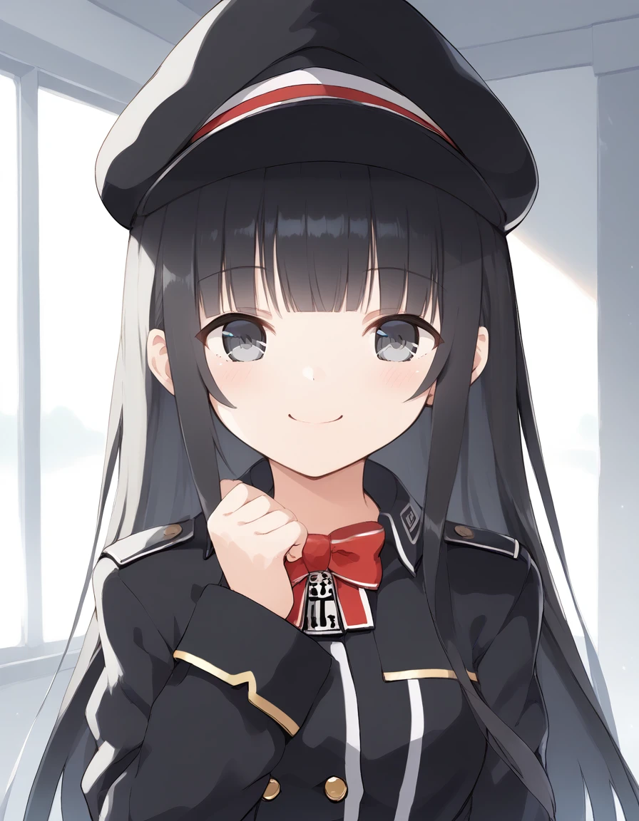 AzlaZ19, hat,black hair, long hair,gray eyes,blunt bangs,long sleeves jacket,bowtie,midriff,skirt, thighhighs,suspenders,garter straps