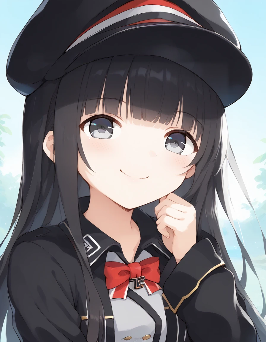 Recommended Prompts: 1girl, hat,black hair, long hair,gray eyes,blunt bangs,long sleeves jacket,bowtie,midriff,skirt, thighhighs,suspenders,garter straps,