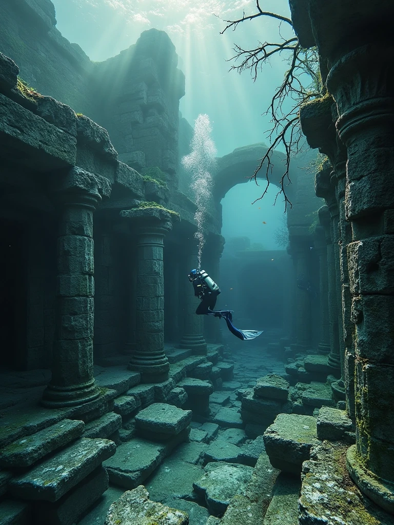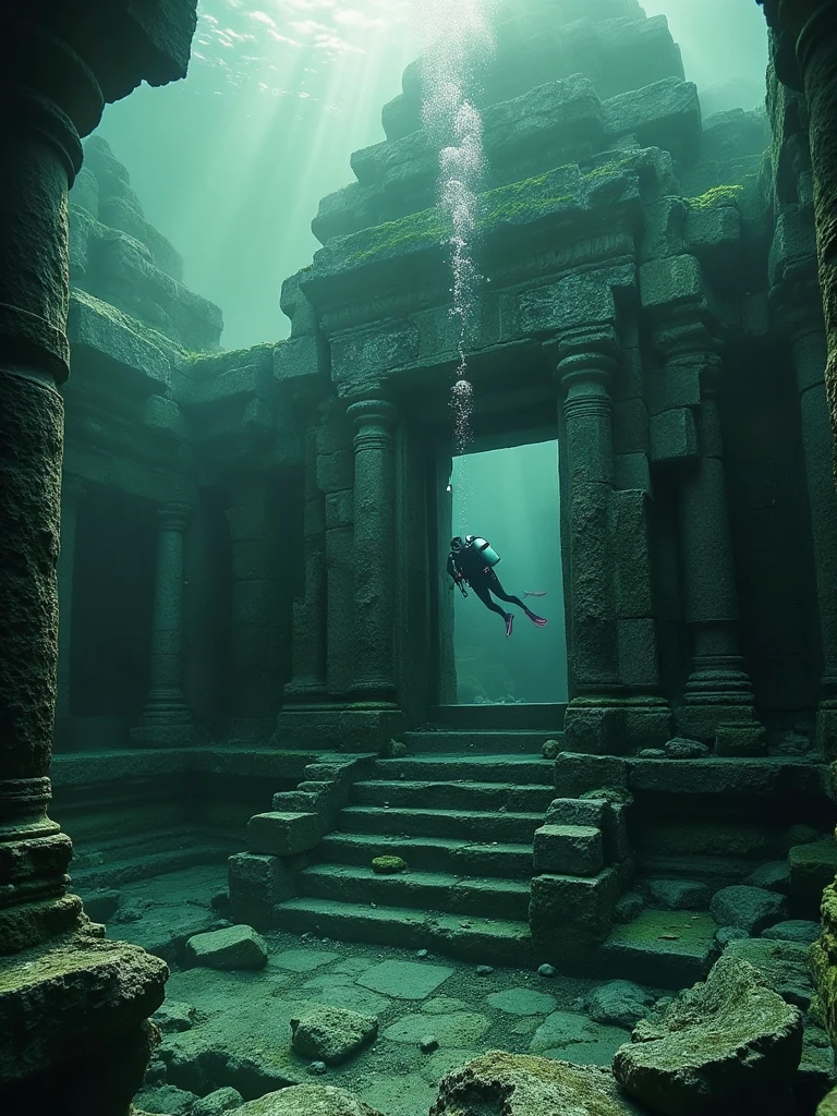 Underwater ruins and divers, light filters through water, crumbling temples stand, divers swim near fallen columns, a sense of lost history.