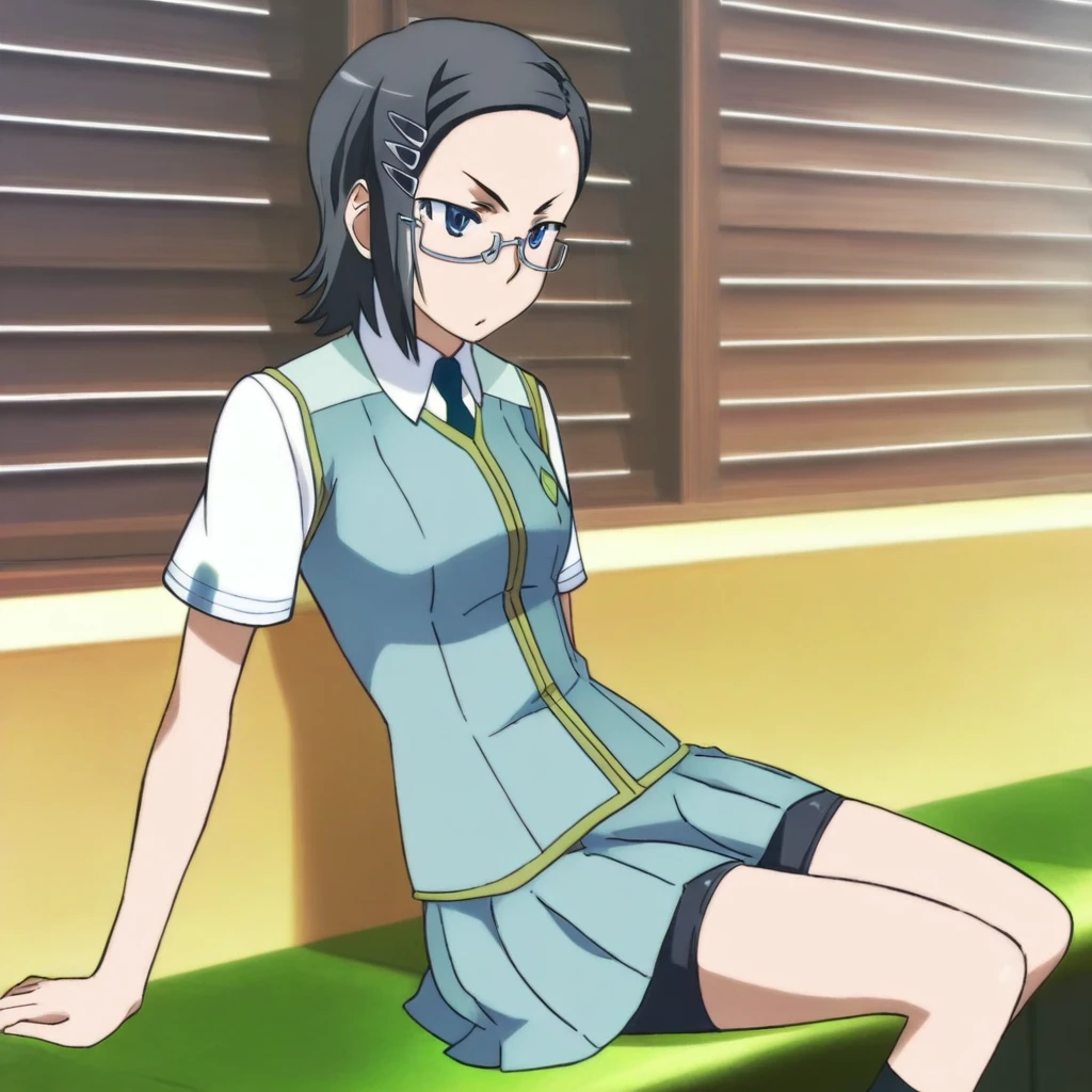 kotetsu katsura (character), glasses, black hair, blue eyes, short hair, semi-rimless eyewear, hair ornament, hairclip, small breasts,