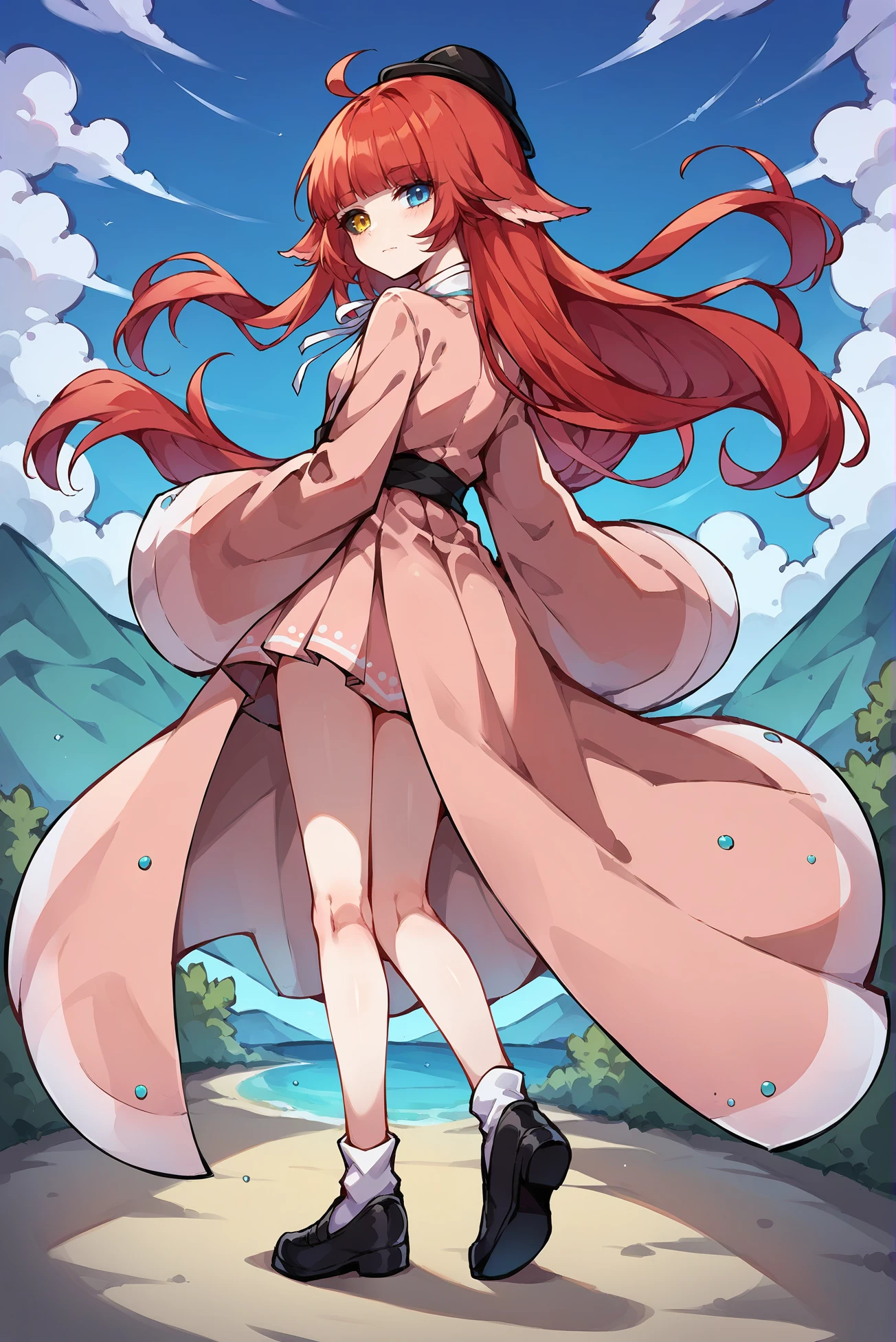 Character: low-tied long hair, red hair, ahoge, blunt bangs, heterochromia, yellow eyes, blue eyes, small breasts, animal ears, floppy ears, mismatched sclera