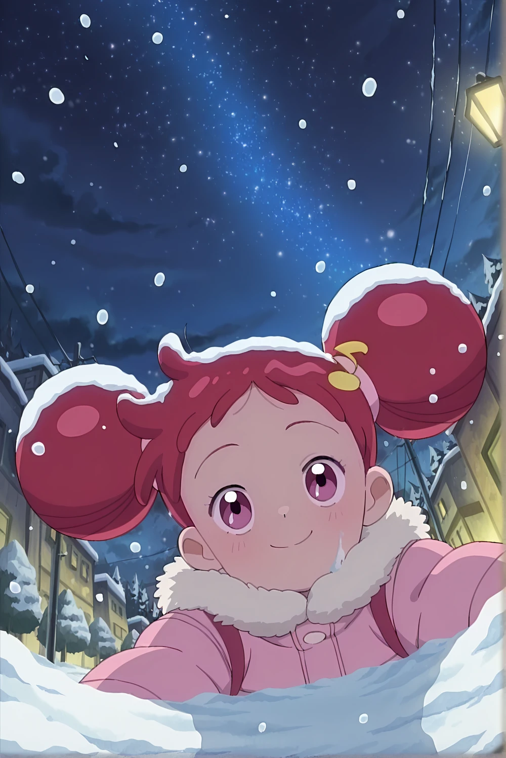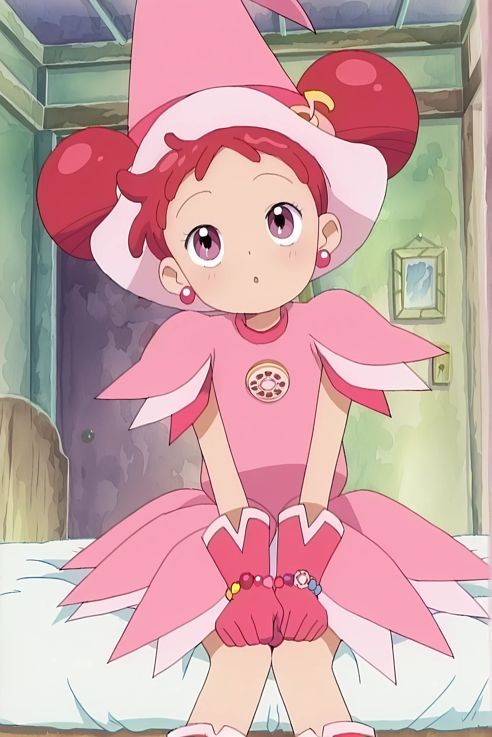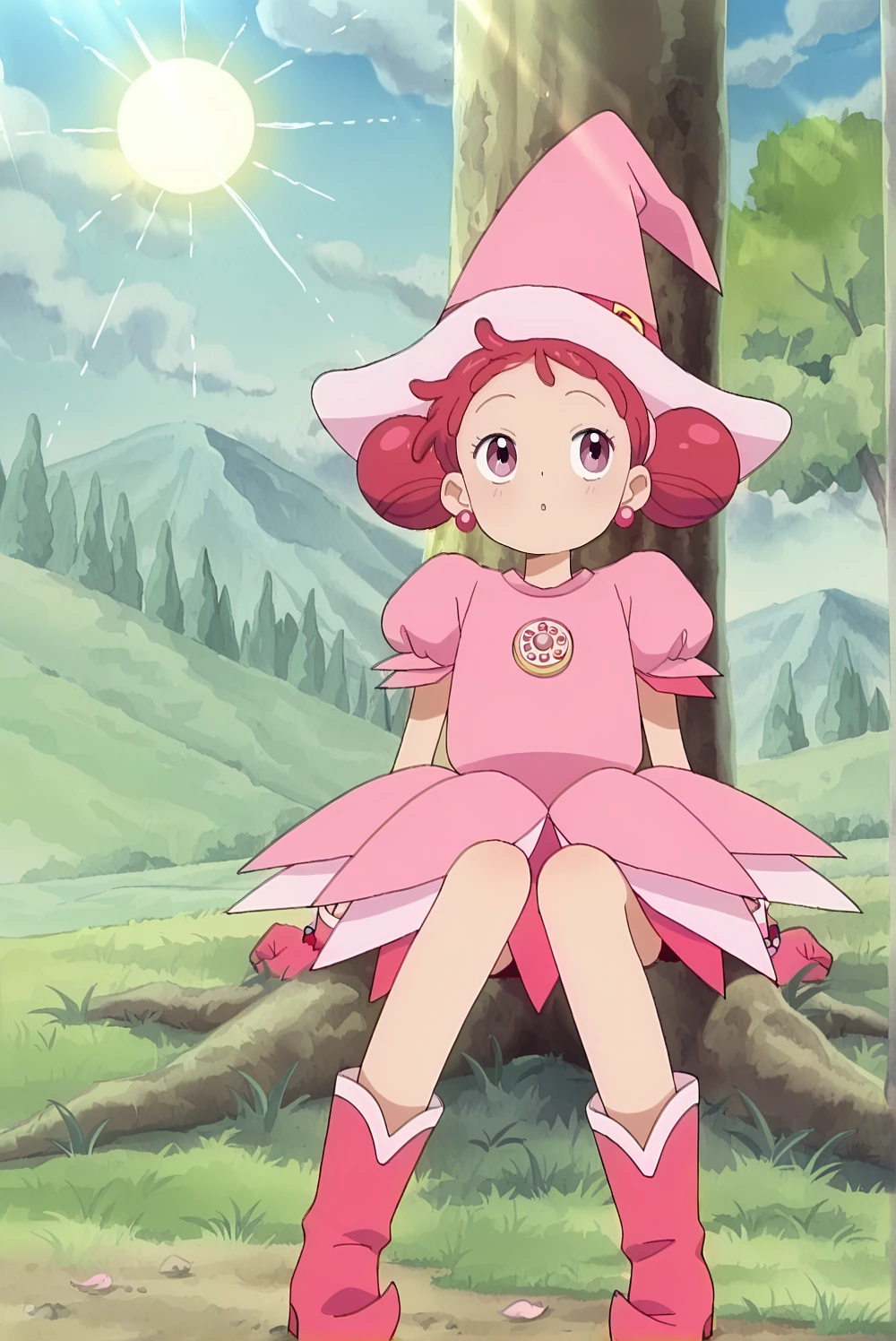 Witch: doremi-ha, witch outfit, 1girl, pink hair, short hair, pigtails, hair ties, pink eyes, pink witch outfit, witch hat, puffy sleeves, petal skirt, boots, gloves, brooch, earrings