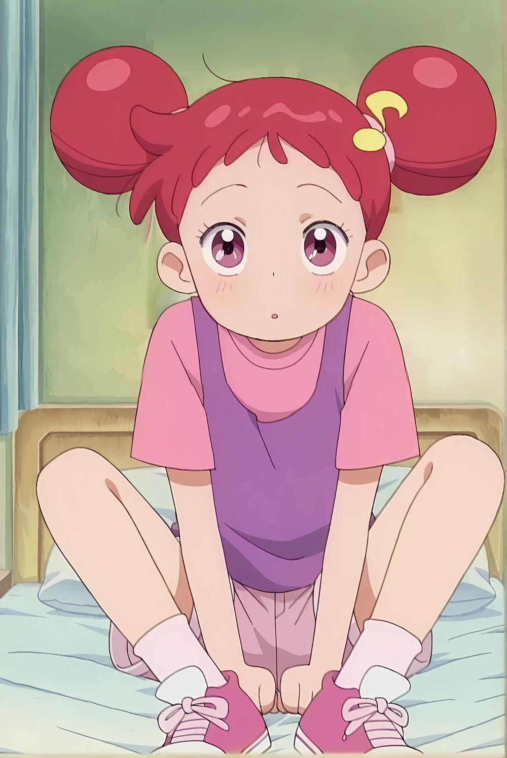 Casual: doremi-ha, casual outfit, 1girl, pink hair, short hair, pigtails, hair ties, pink eyes, pink shirt, short sleeves, purple tank top, pink shorts, sneakers, socks