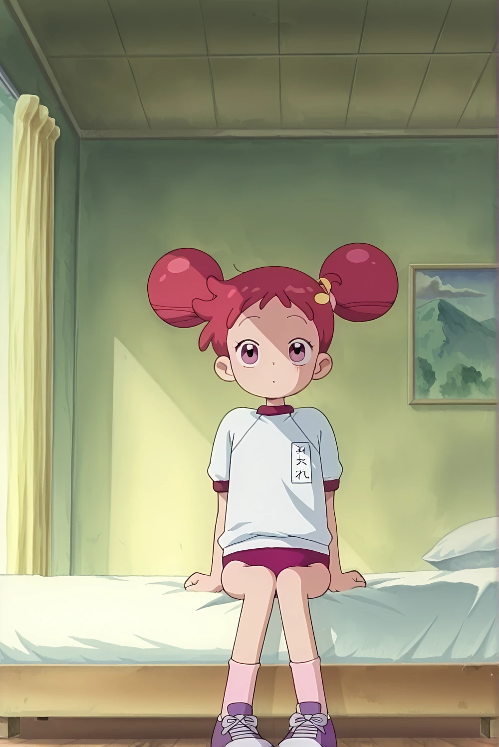 Gym: doremi-ha, gym uniform, 1girl, pink hair, short hair, pigtails, hair ties, pink eyes, white shirt, white shirt with magenta accents, short sleeves, magenta buruma, pink socks, nametag, purple sneakers