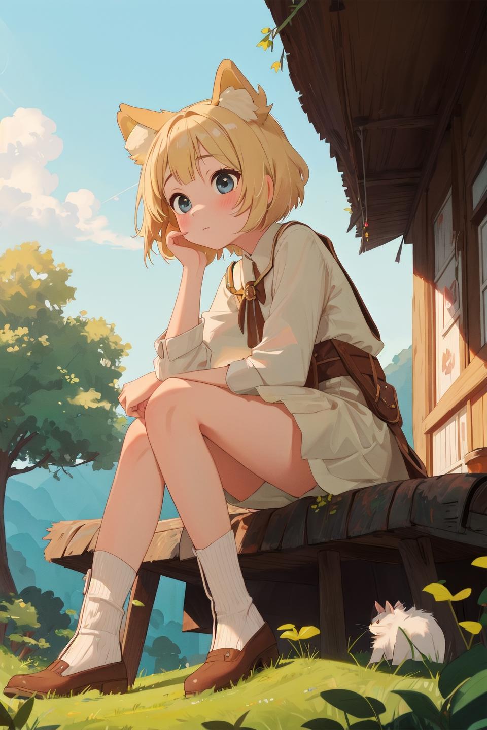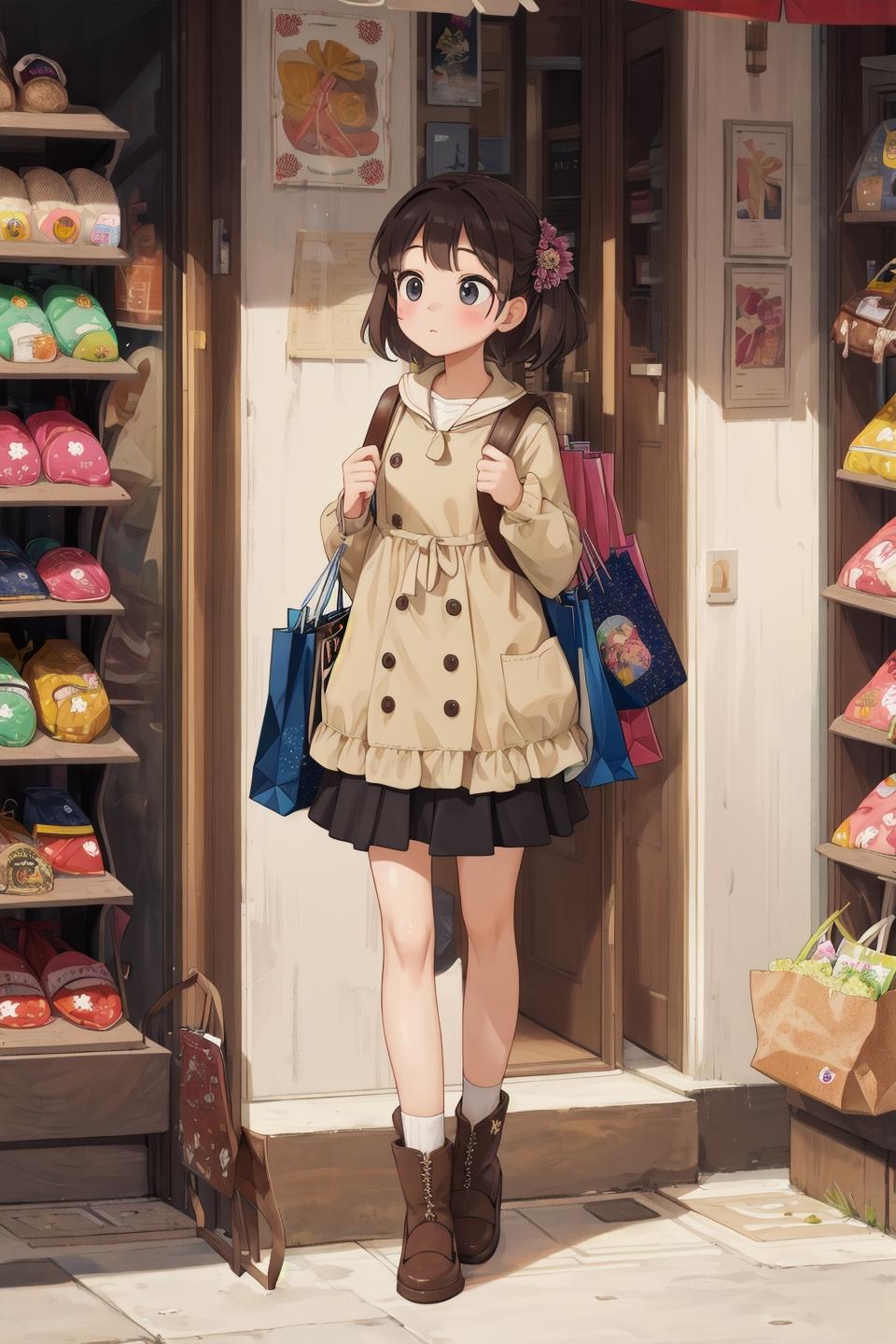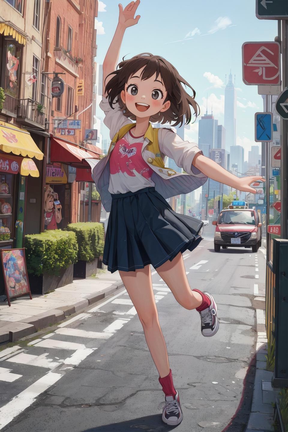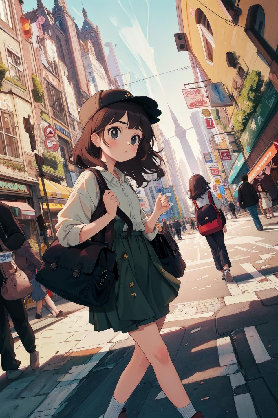 a tall figure relative to the cute face, and a detailed background; all these elements