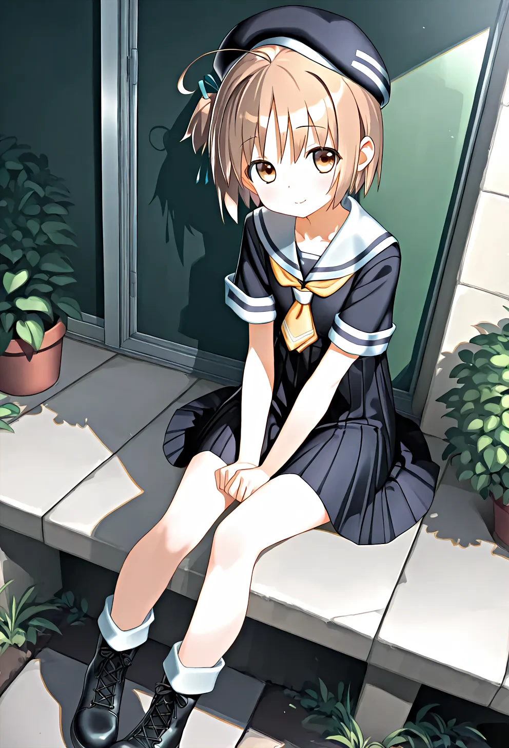 nono-default,nekomiya nono,brown eyes,brown hair,short hair,one side up,hair ribbon,ahoge,sailor hat,school uniform,white sailor collar,black dress,shirt,skirt,yellow necktie,short socks,black boots