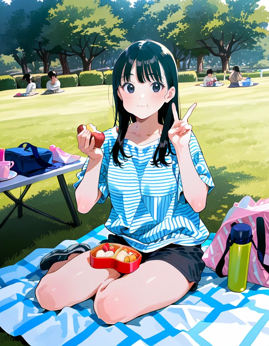 picnic, outdoors, sitting, shoes removed, socks, food, thermos, bag, grass, lunch time, bento, picnic blanket,